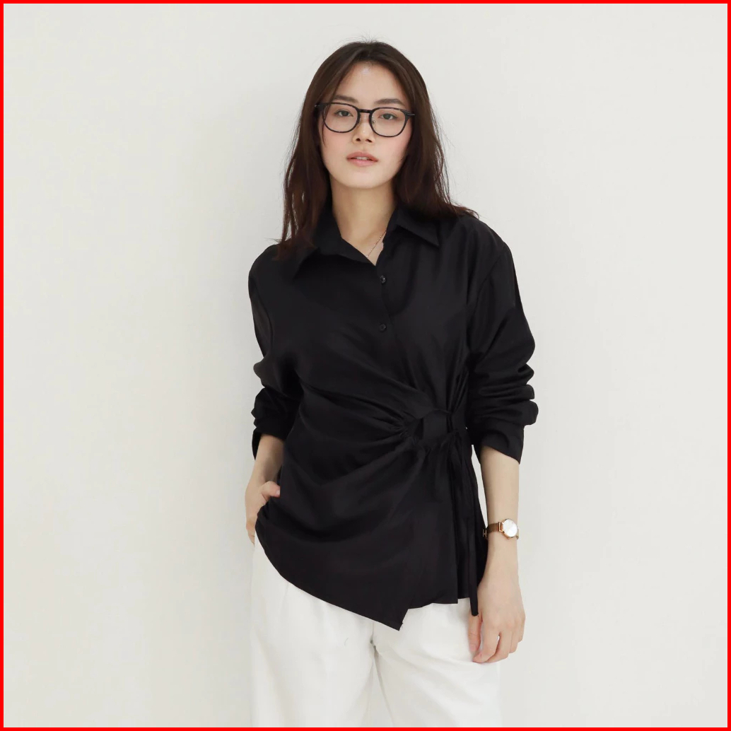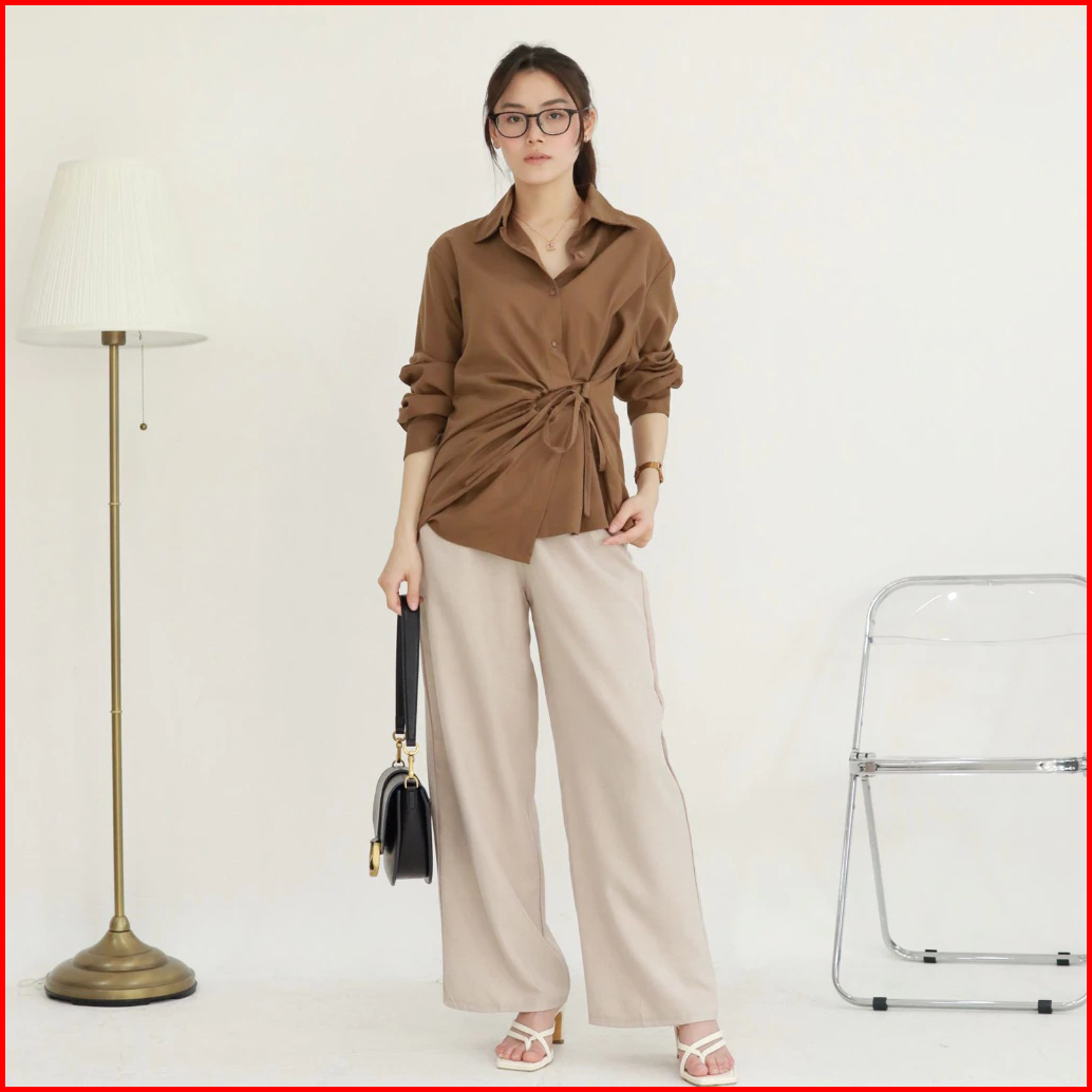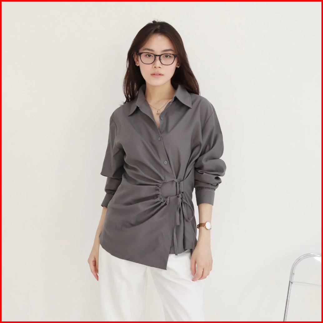 Exclusive Msmo Karis Assymetrical Shirt Blouse Wanita Basic Kemeja Wanita Casual Brown Grey