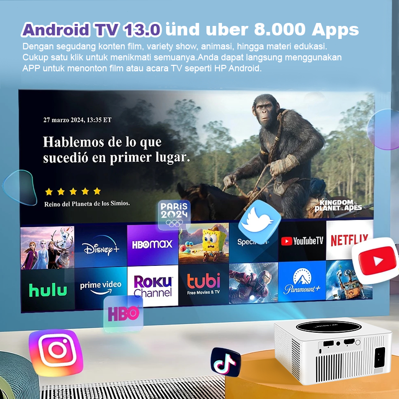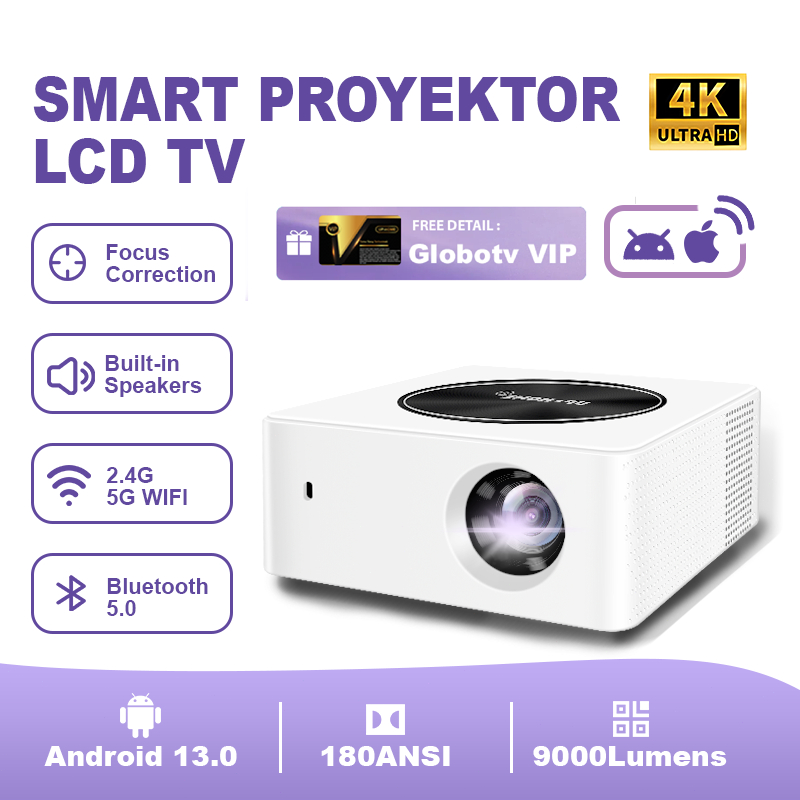 Smart Proyektor Portable Led Android 13.0 Bluetooth Proyektor 2.4+5G Wifi 6 Portabel Minimalis - Full HD 1080P - 9000 Lumen - Auto Keystone - Netflix - YouTube - 180 ANSI- mini Home Theater Proyektor