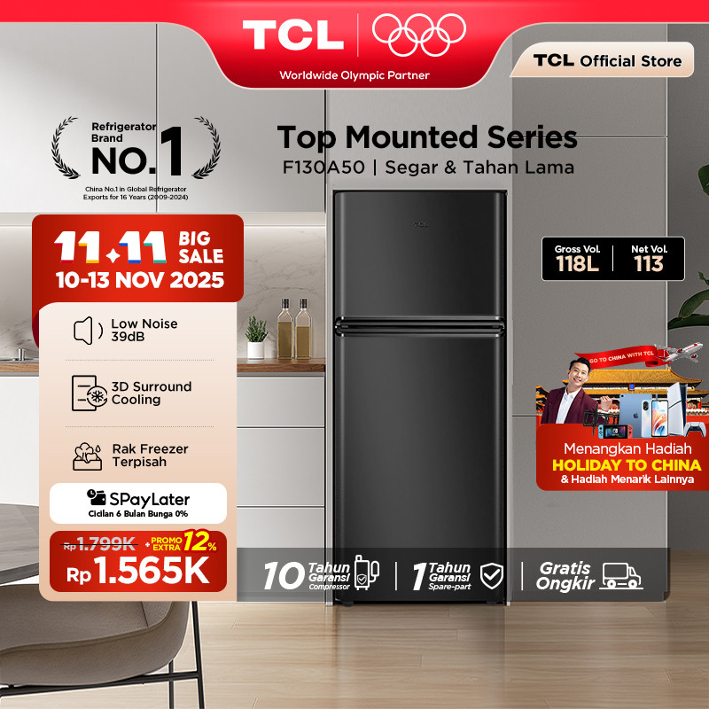 TCL Kulkas 2 Pintu (F130-A50) - Kapasitas 118L - Rak Freezer Terpisah - 3D Surround Cooling - Adjustable shelves - Low N