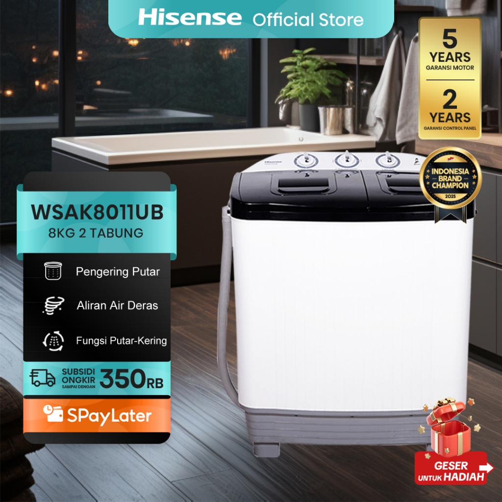 Hisense Mesin Cuci WSAK8011UB Top Loading Twintube Kapasitas 8KG 2 Tabung Bukaan Atas Pengeringan Udara Bak Putar Aliran