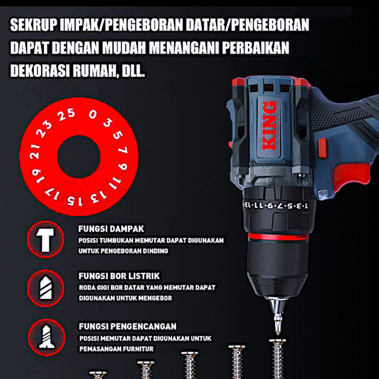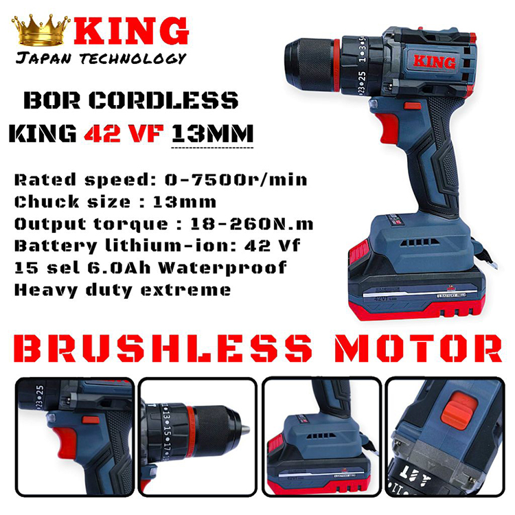 Bor Baterai 42 Vf King Bor Cordless Bor Impact Drill Fullset Koper