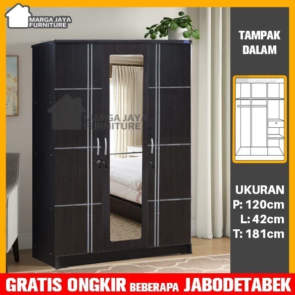 Lemari Pakaian Baju 3 Pintu + Cermin + Laci Hitam Putih