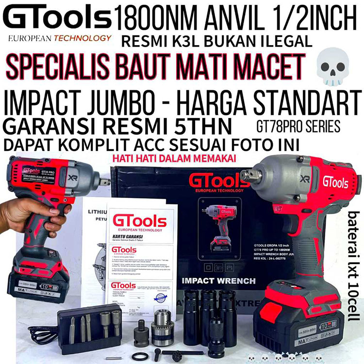 Gtools Eropa GT33PRO Impact Wrench Bor Pembuka Baut Standar kekuatan Jumbo 1800NM Garansi Resmi