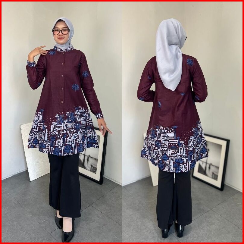 Rasaraya Batik Flanna Tunik Wanita Katun - Atasan Batik Kerja Kantor Maroon Elegan Busui Friendly
