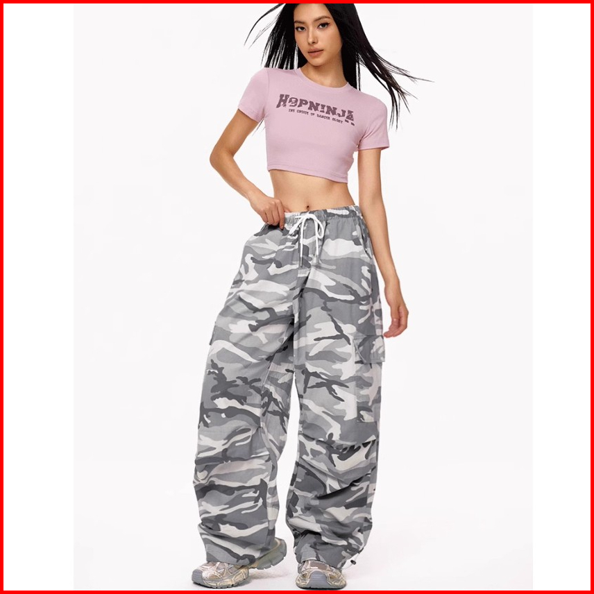 Keygirl Celana Cargo Parasut Wanita Cargo Camo Loose Cargo Pants Korean Style Celana Banyak Kantong Wanita Oversize Dewa