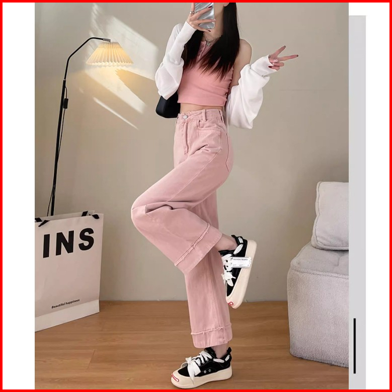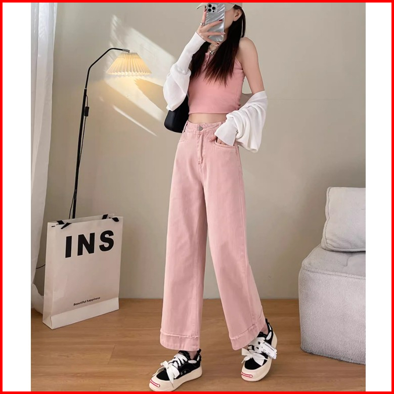 Keygirl Highwaist Loose Kasual Jeans Wanita Korea Style Pink Jeans Wanita Model Realpict