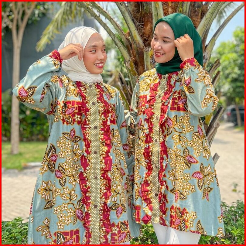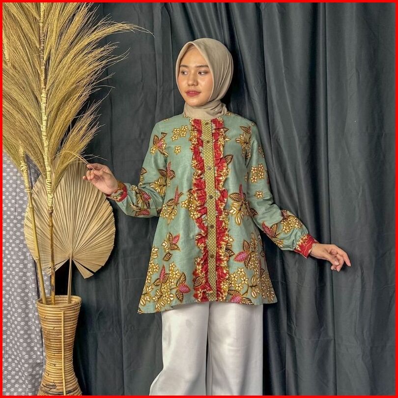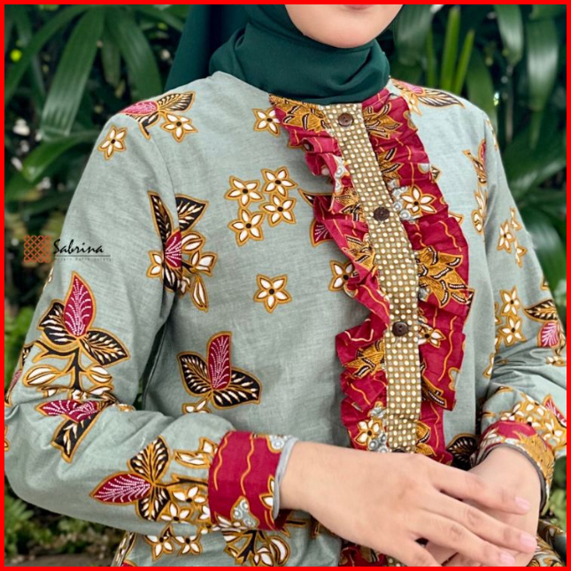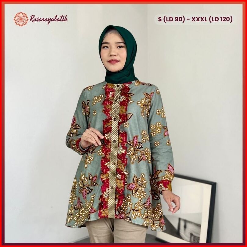 Rasaraya Batik Rauna Kemeja Wanita Katun - Atasan Batik Kerja Sage Maroon Busui Friendly