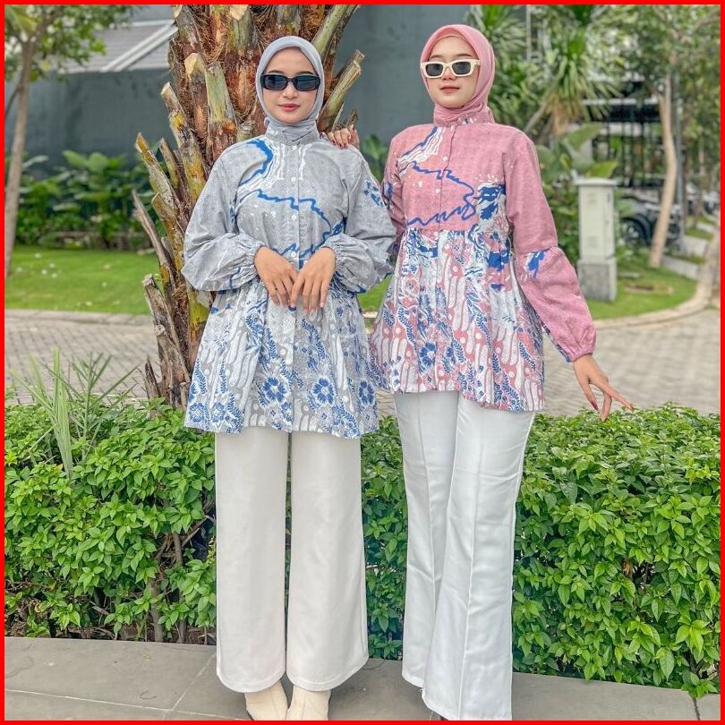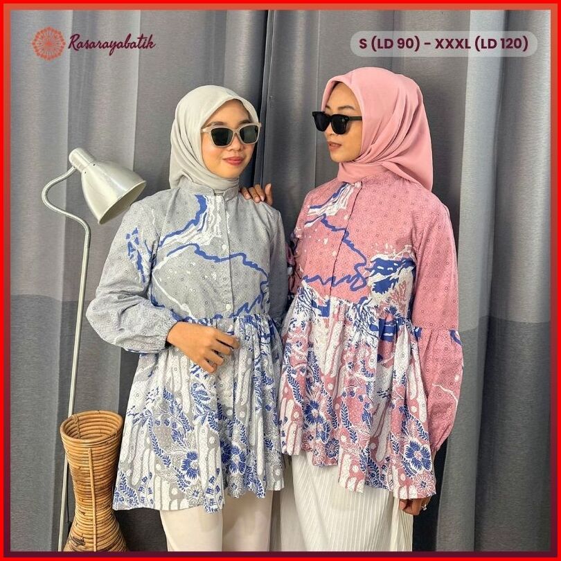 Rasaraya Batik Mina Blouse Batik Wanita Katun - Atasan Batik Kerja Lengan Panjang Pink Abu-abu