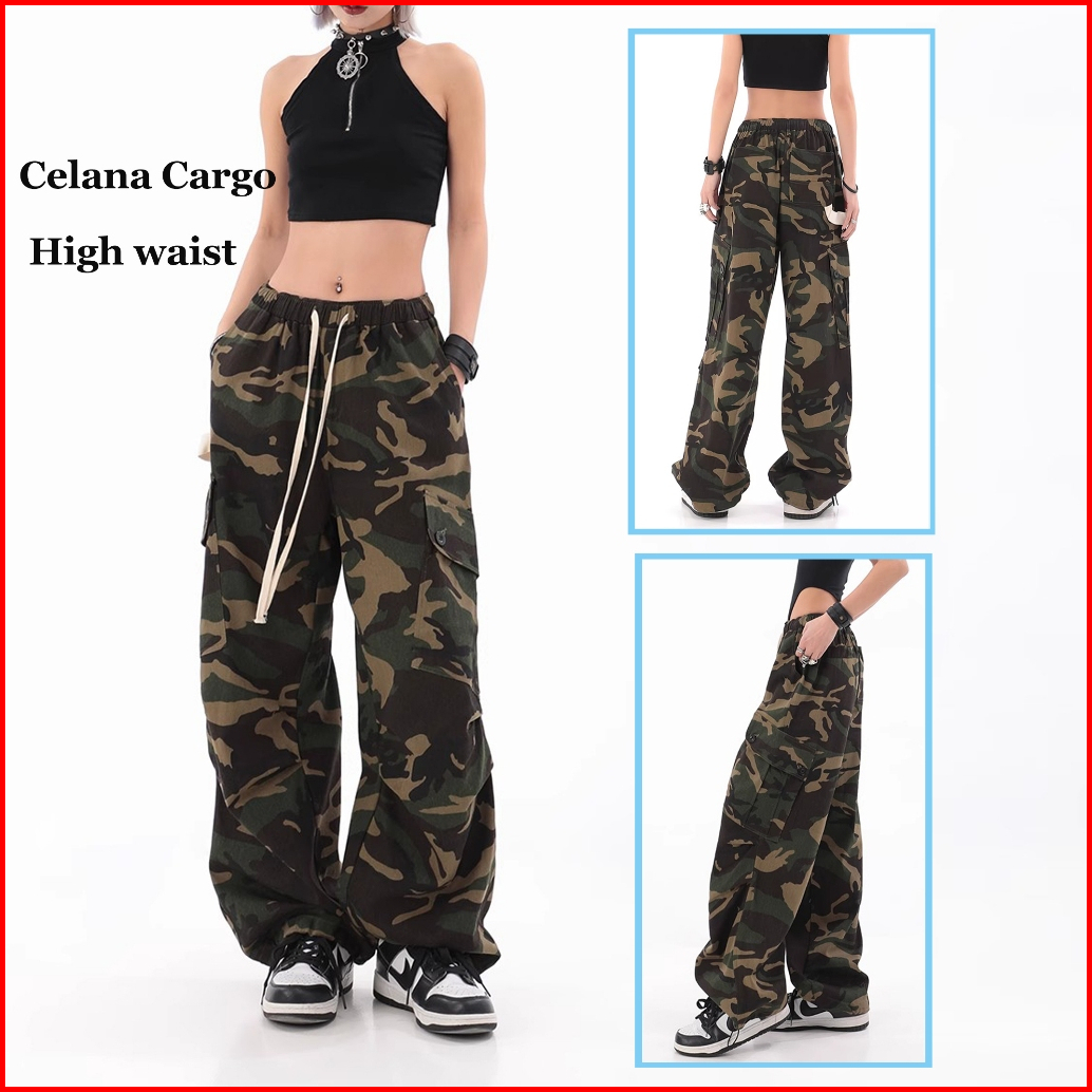 Keygirl S-5xl Street Style Celana Cargo High Waist Kasual New Fashion Celana Loose Pants Wanita Jumbo Celana Kulot Cargo