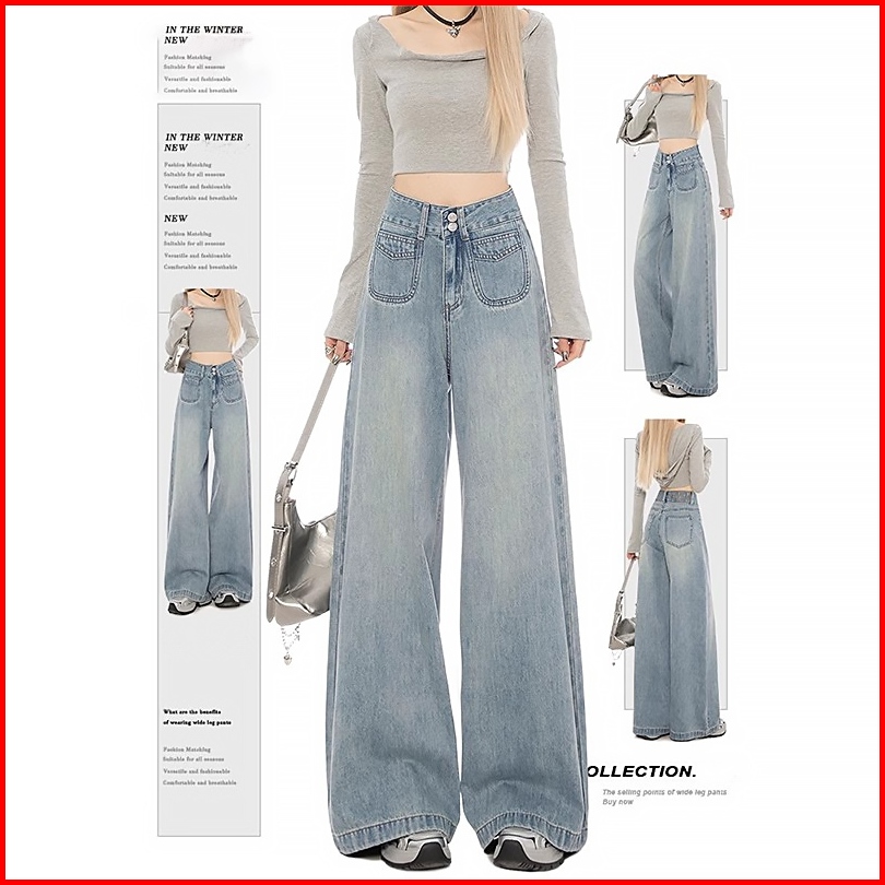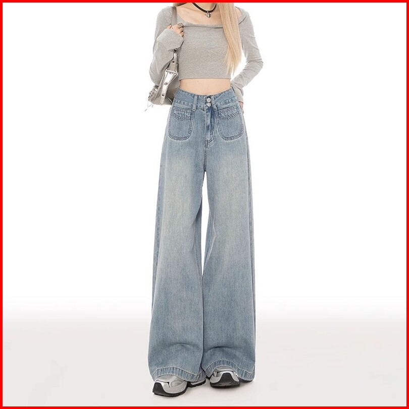 Keygirl Celana Jeans Berkobar Pinggang Tinggi Baggy Jins Wanita Longgar Lurus Celana Denim Kaki Lebar Lurus Kasual Jumbo