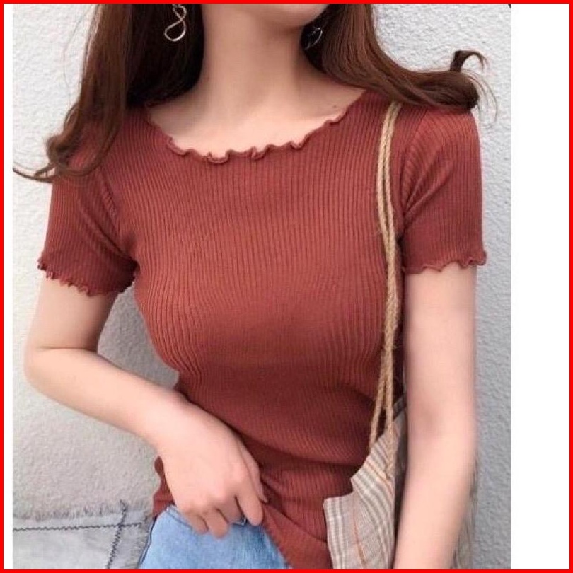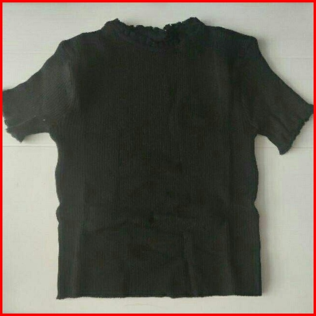 Baju Crop Rajut Kriwil Wanita - Tshirt Crop Rajut Kriwil Pendek Korean Ruffle Neck T-shirt Kaos Rajut Wanita C207