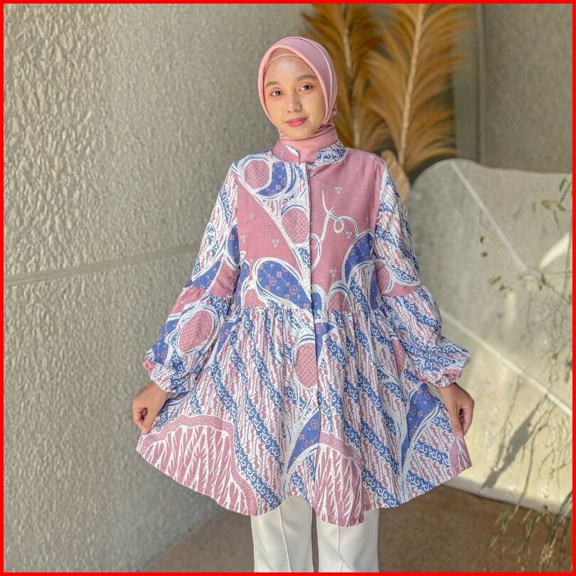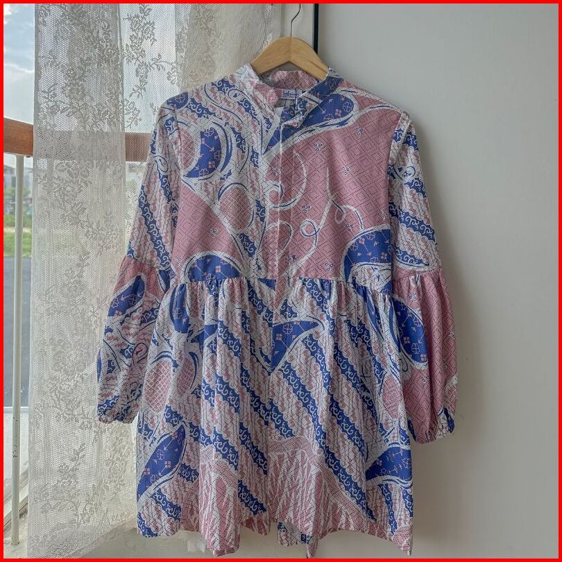 Rasaraya Batik Ollan Blouse Wanita Katun - Atasan Batik Pink Biru Pastel Busui Lengan Panjang