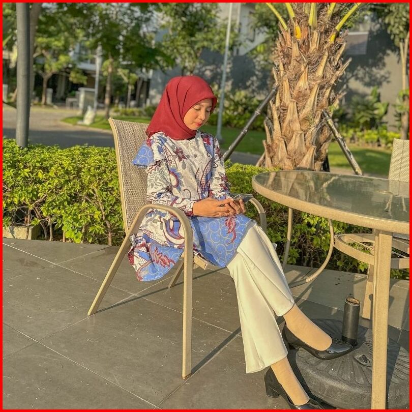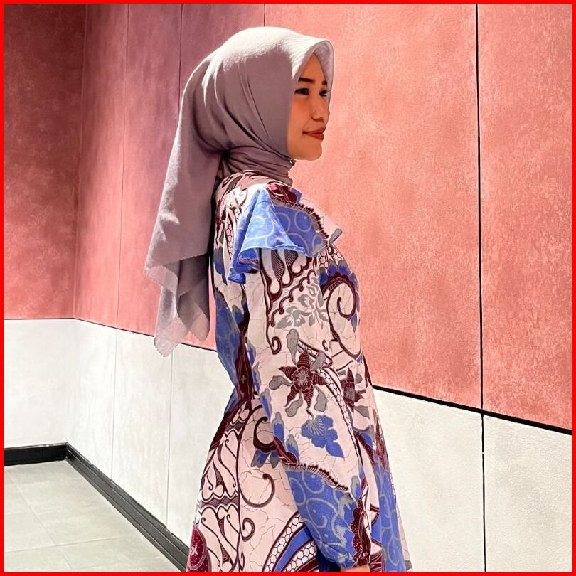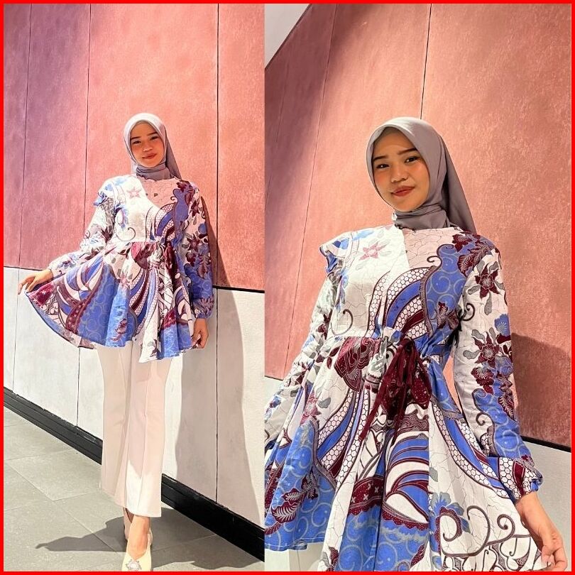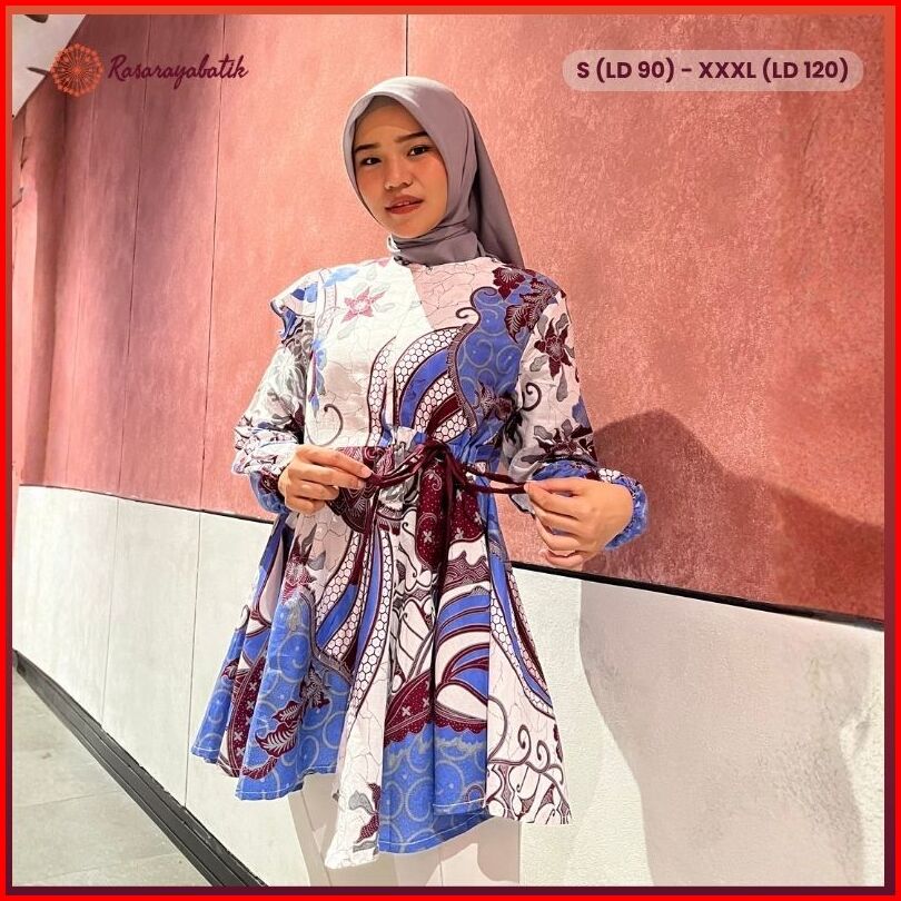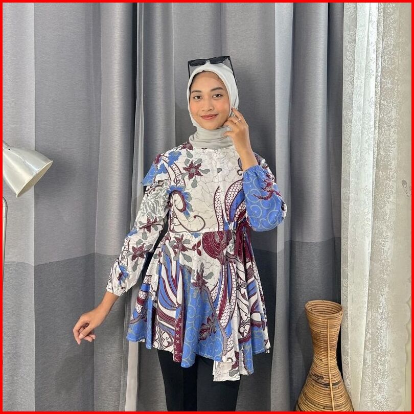 Rasaraya Batik Ivana Blouse Wanita Katun - Atasan Kerja Kantor Maroon Biru Benhur Peplum Asimetris