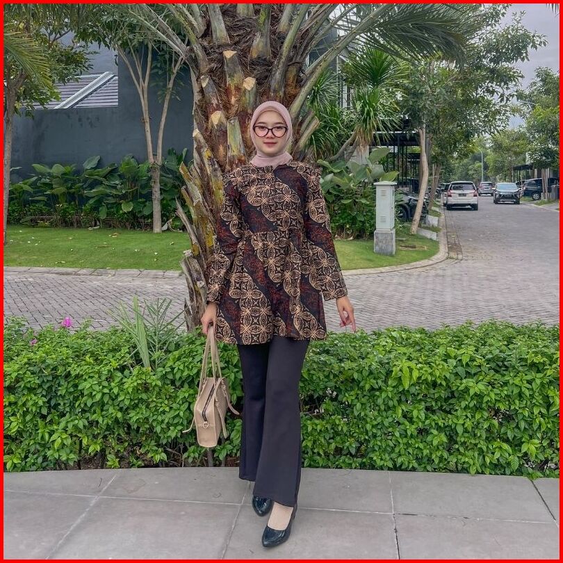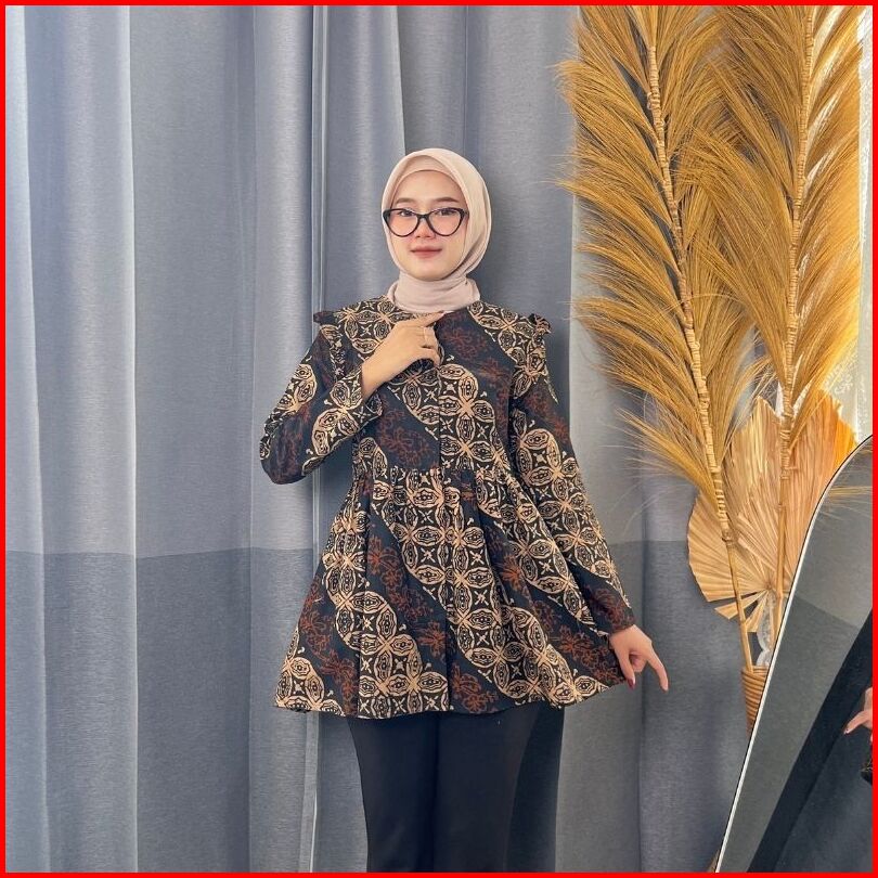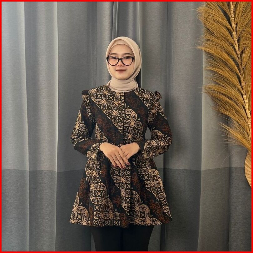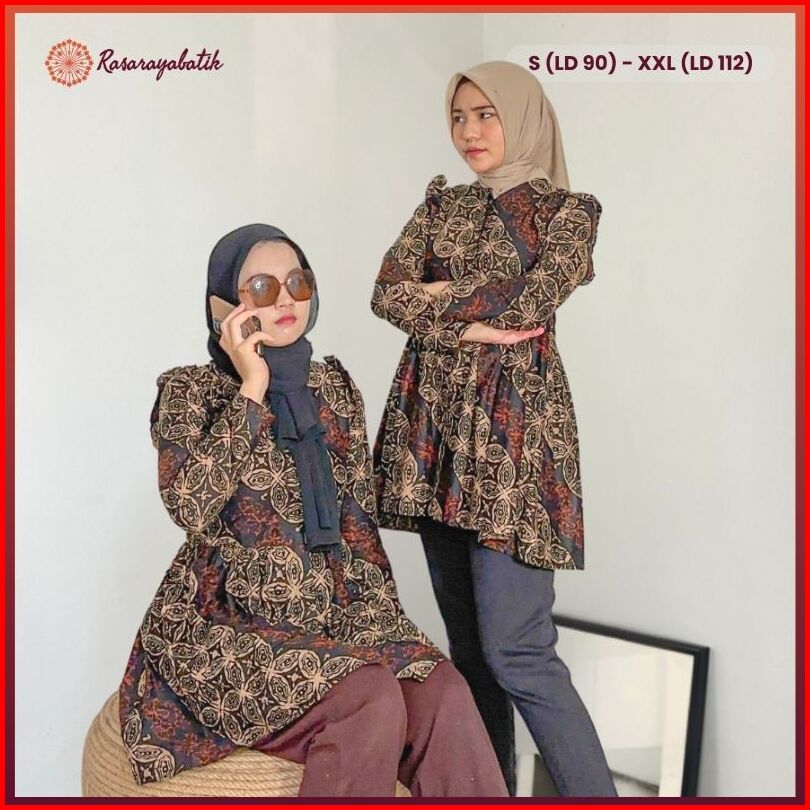Rasaraya Batik Haera Tunik Wanita Katun - Atasan Batik Kantor Sogan Coklat Hitam Elegan Busui