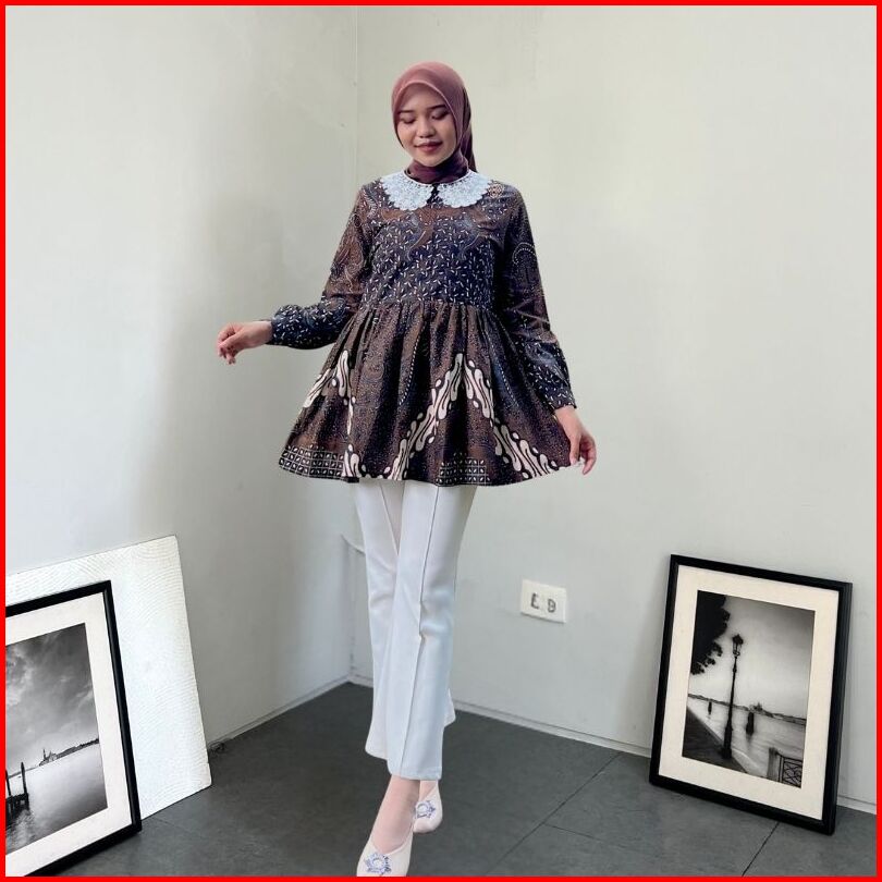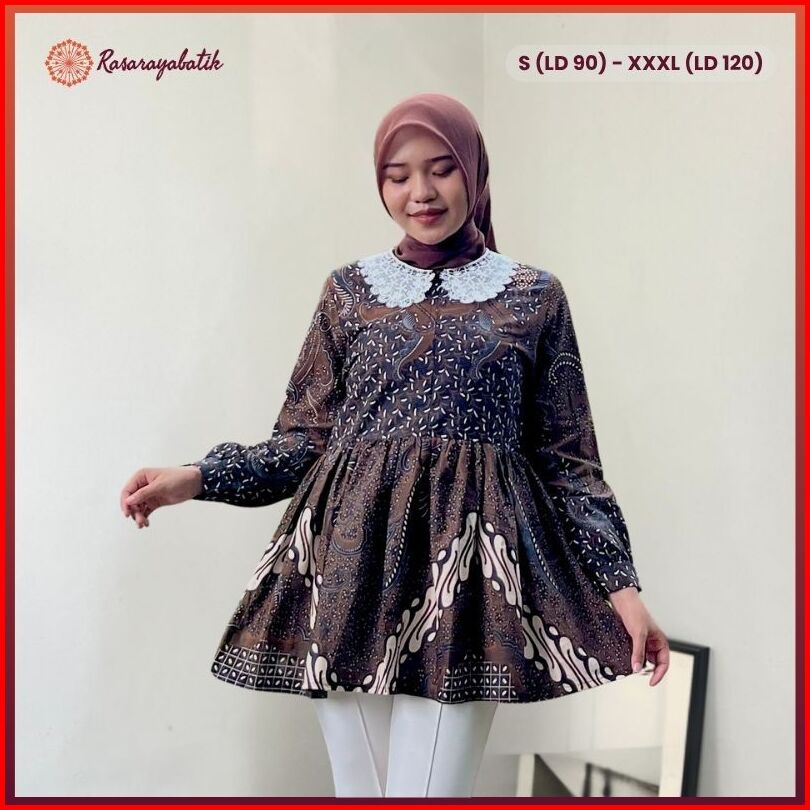 Rasaraya Batik Bruna Blouse Wanita Katun - Atasan Kerja Sogan Lace Warna Coklat Klasik Kerah Renda
