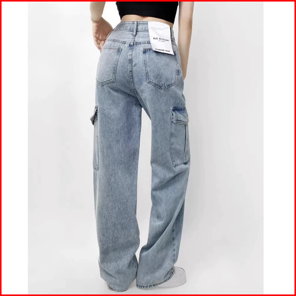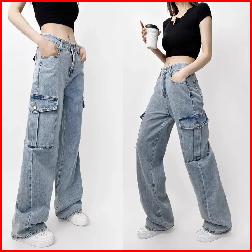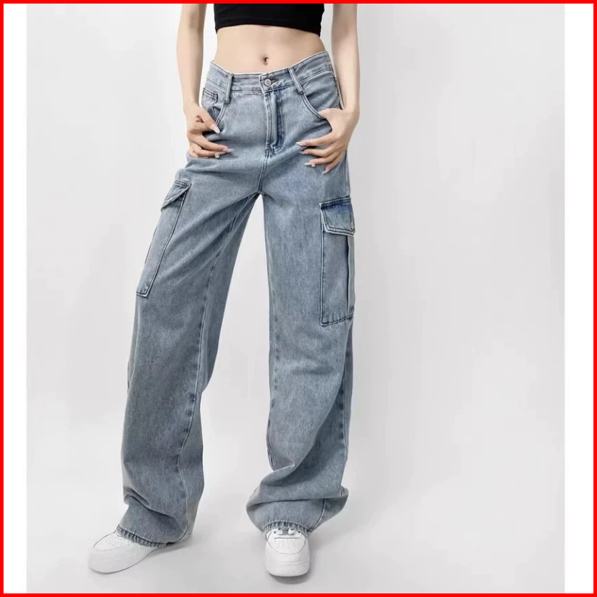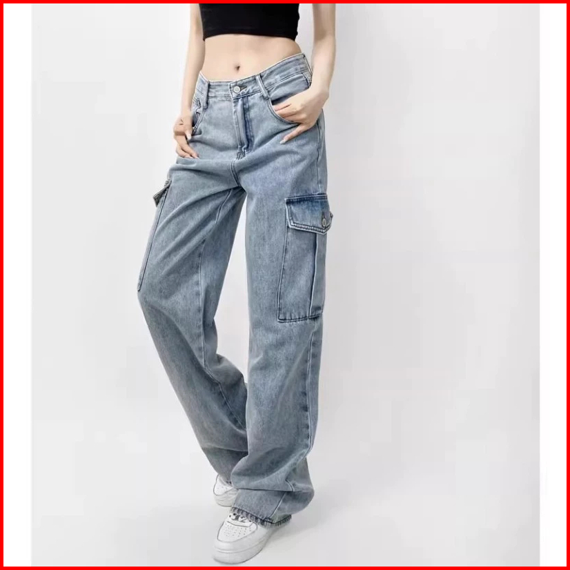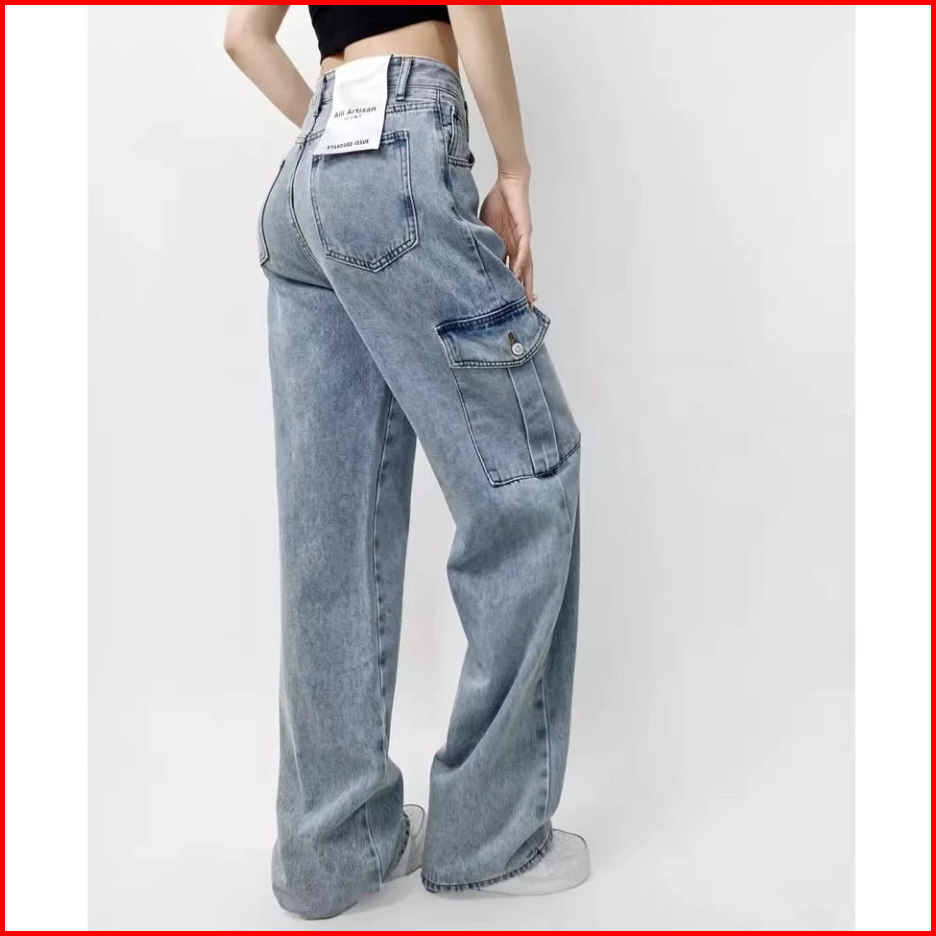 Keygirlreal Pictcelana Baggy Pants Ripped Biru Retro Korean Style New Biru Cargo Highwaist Vintage Celana Kulot Casual J