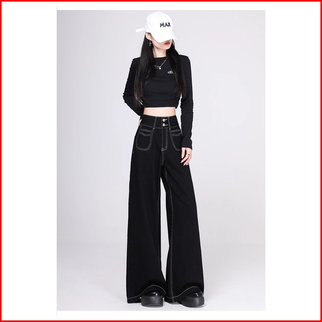 Real Pict Celana Jeans Wanita Baggy Jeans Wide Leg Jeans Hitam Celana Jeans Gombrong Wanita Terbaru