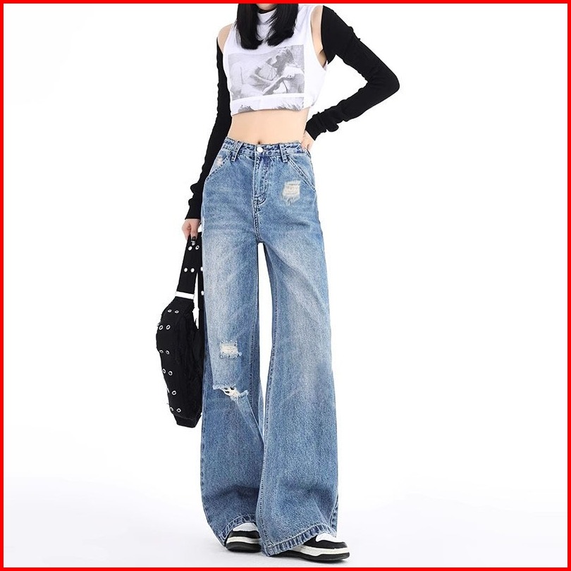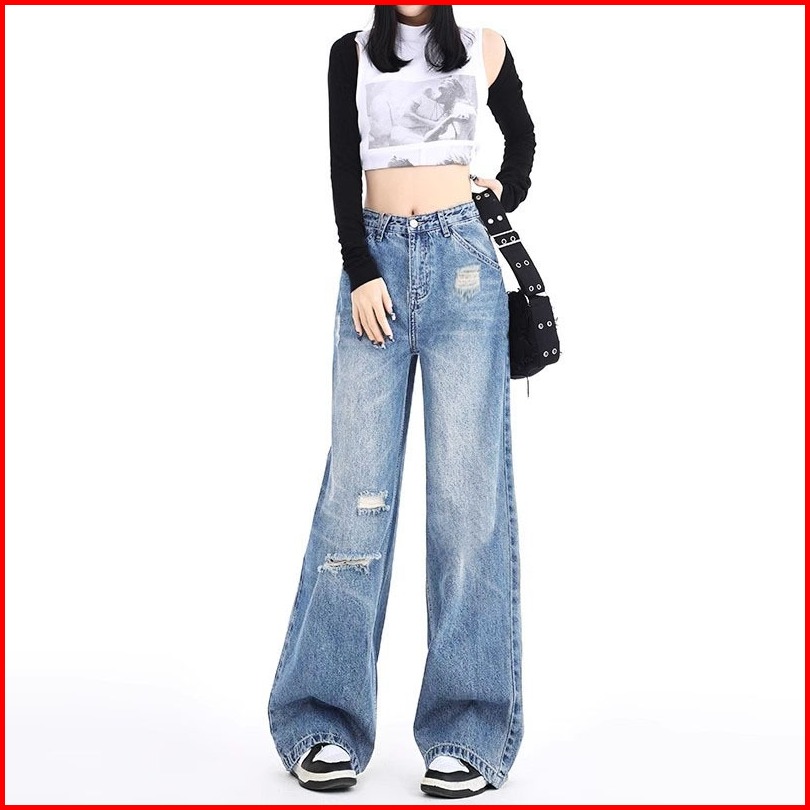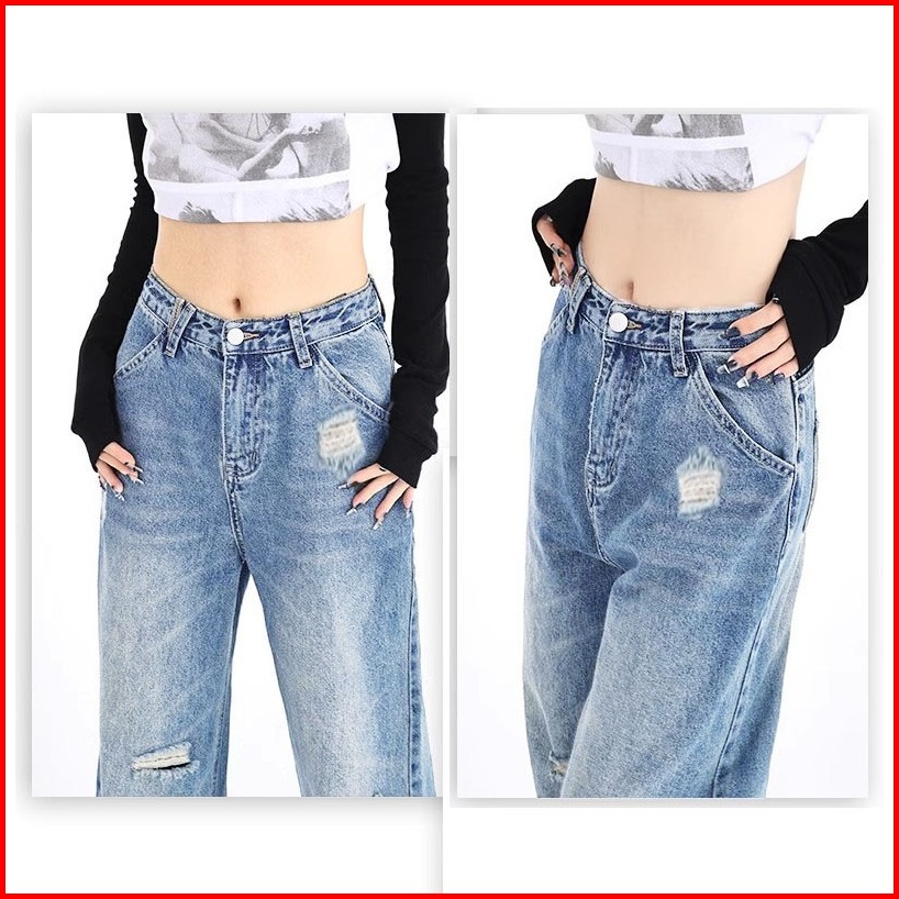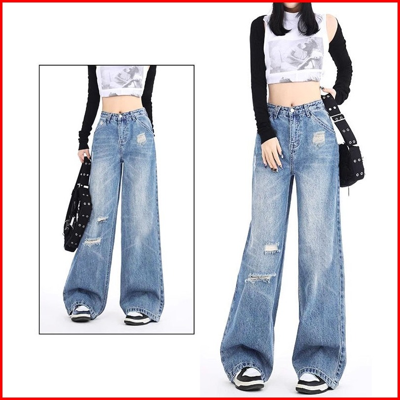 Keygirl Celana Panjang Highwaist Wanita Jeans Premium Ripped Oversize Baggy Loose Jeans Kolut New Retro Biru Fashion Den