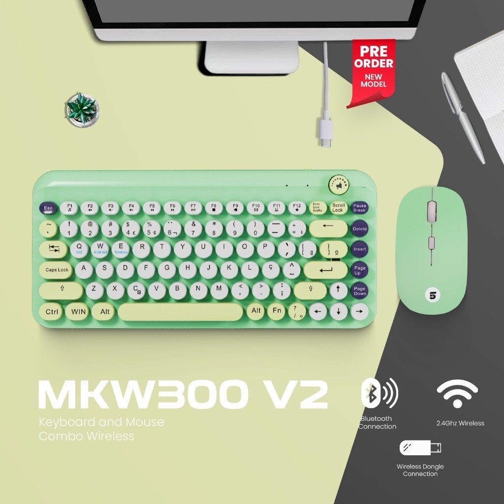 5Star MKW300 V2 New Set Keyboard and Mouse Stylish & Colorful 2Mode Wireless 2.4Ghz And Bluetooth Rechargable For PC Laptop, Hp and Tablet