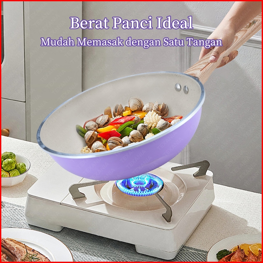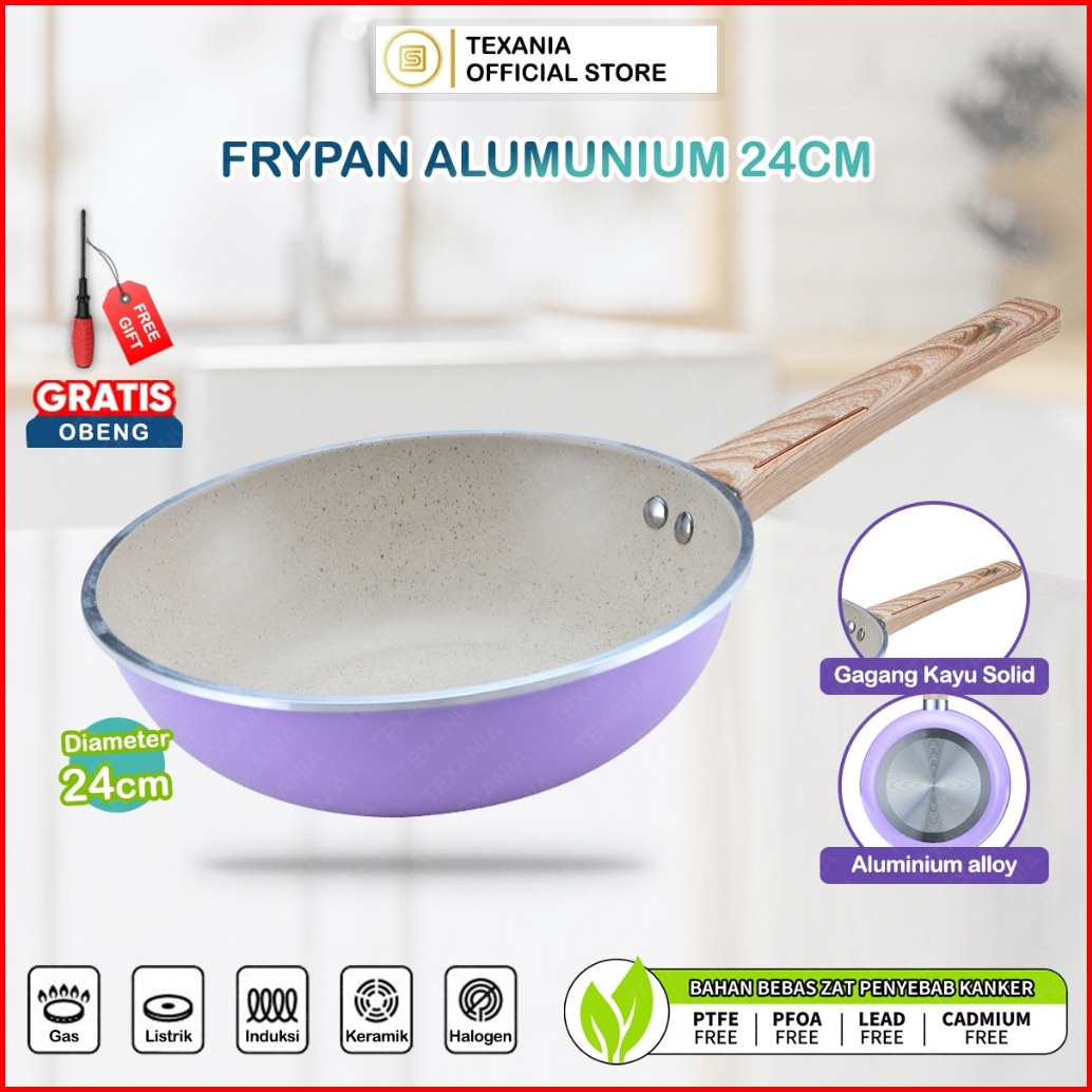 Texanla Wajan Ungu Diameter 24cm Anti Lengket Bahan Alumunium Aloy Gagang Motif Kayu Halus Free Obeng