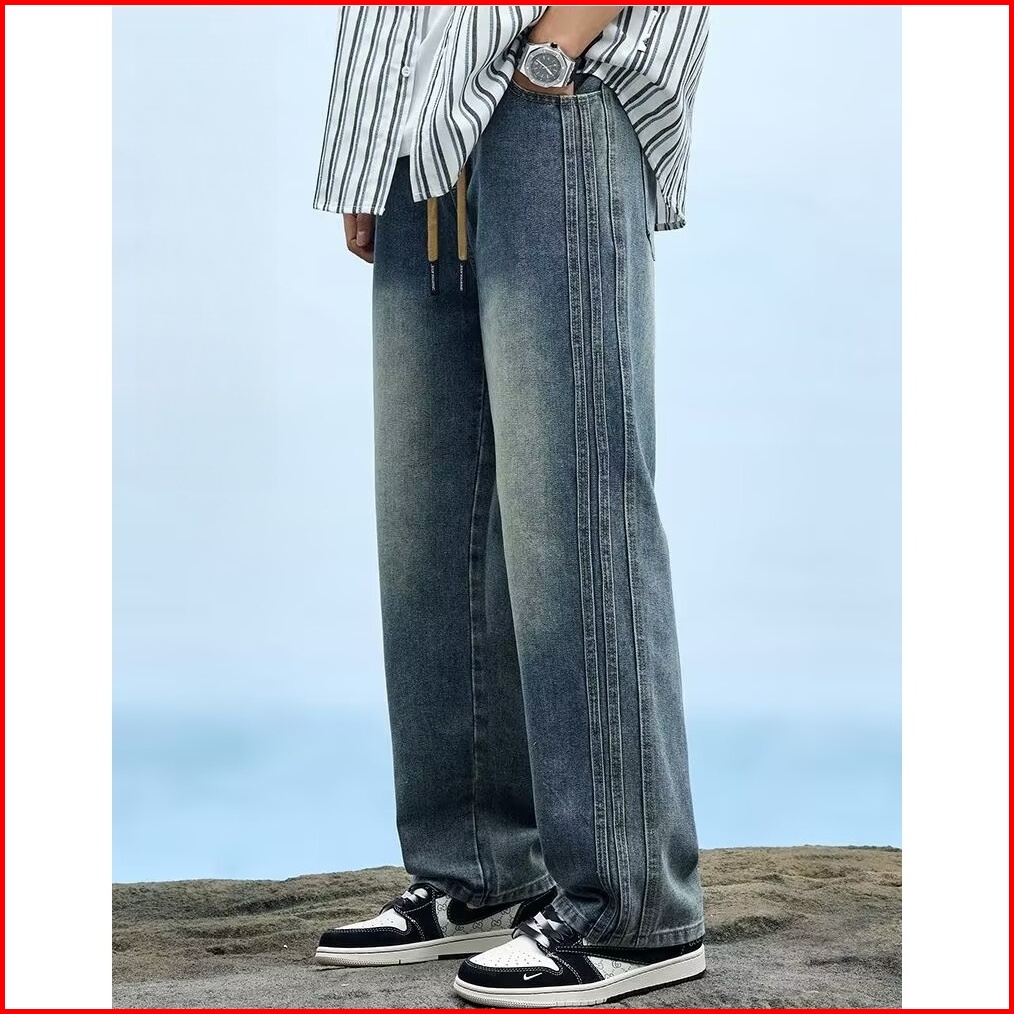 St.lab Studio Celana Denim Lurus Longgar Pria Gaya Korea Celana Denim Pinggang Elastis Celana Denim