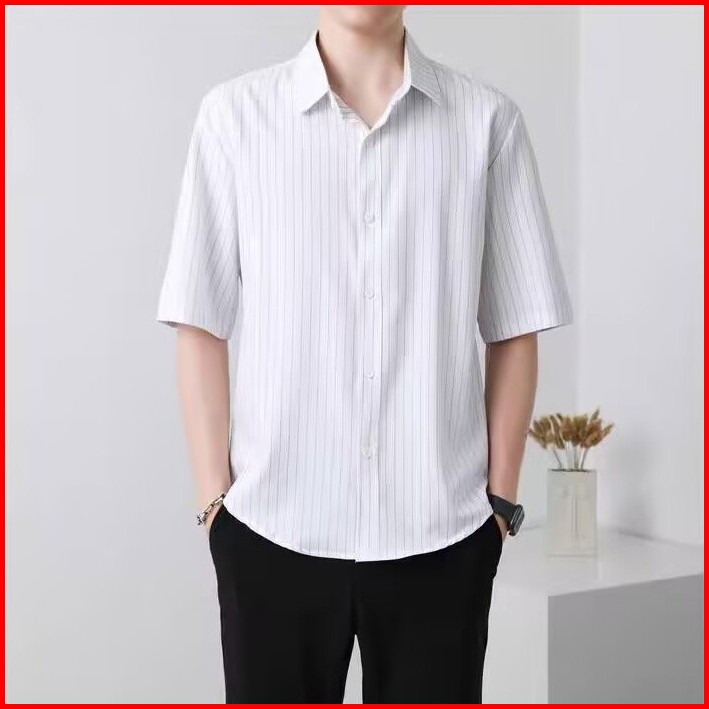 Atasan Kemeja Lengan Pendek Bergaris Longgar Gaya Korea Pria