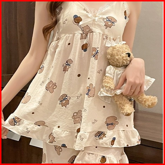 Relax Home Baju Tidur Tali Satu Celana Pendek Setelan Renda Tali Ikat Manis Dan Lucu Dengan Bantalan Dada
