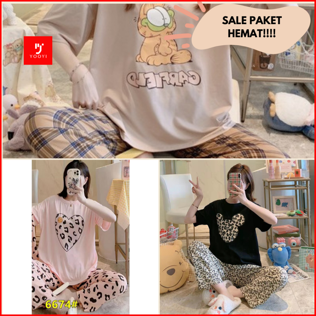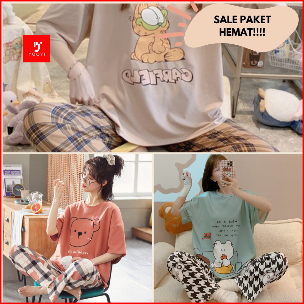 Yooyi Paket Bundle 3 Baju Tidur Wanita Piyama Korea Lengan Pendek Celana Panjang Motif Kartun Lucu Setelan Tidur Murah M