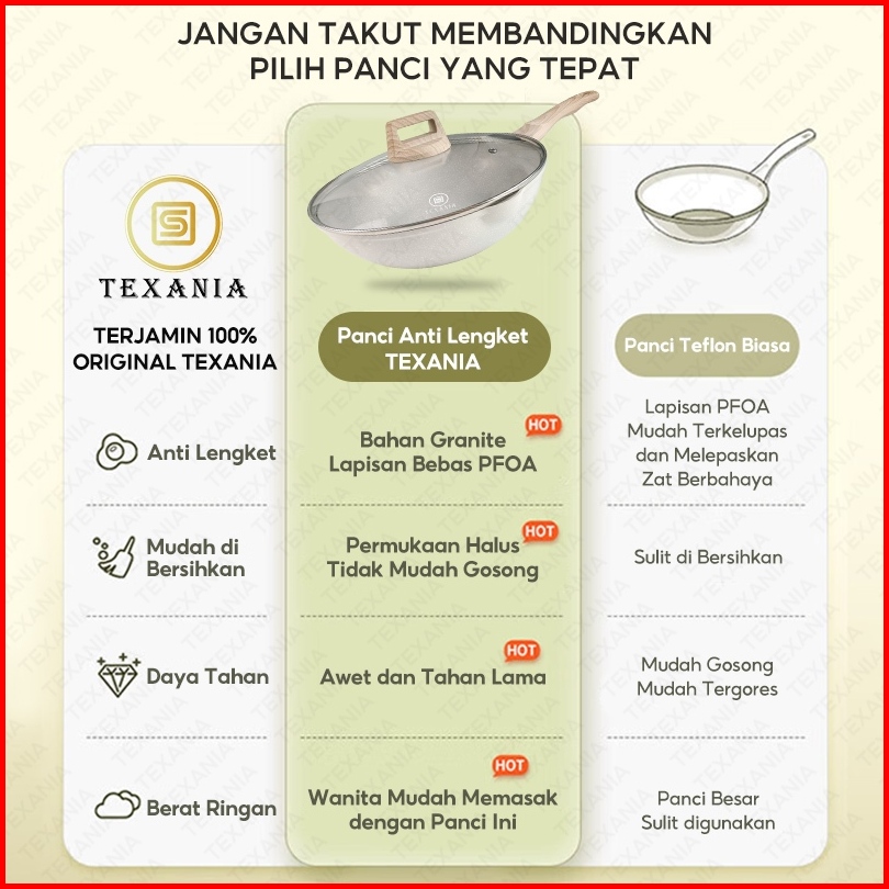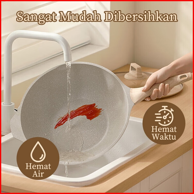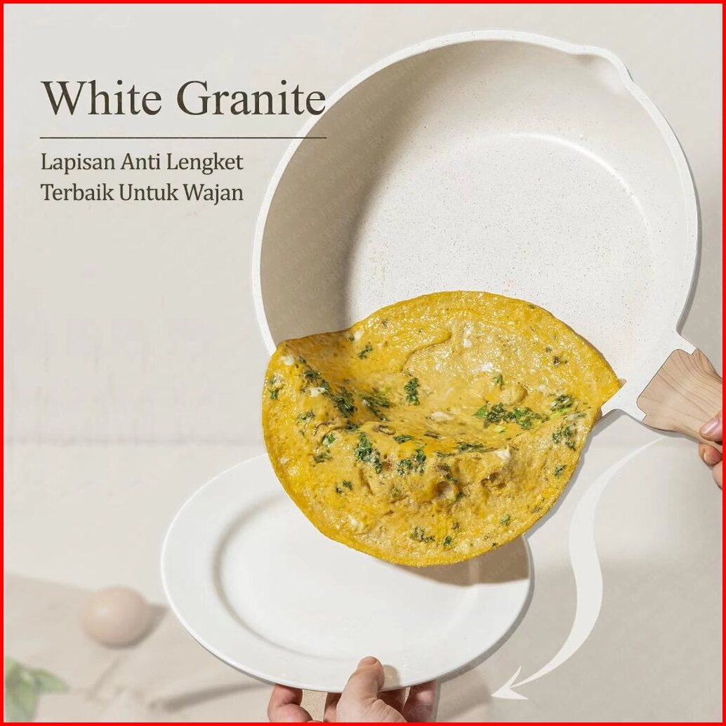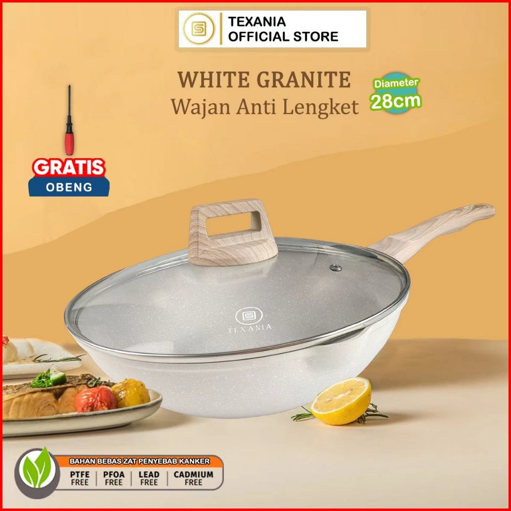 Texanla Wajan Anti Lengket Coating White Granite Bahan Alumunium Double Bottom Diameter 28cm Dengan Tutup Kaca Free Oben