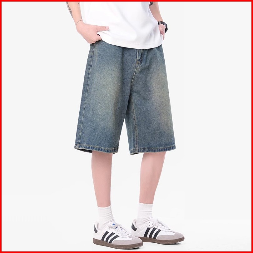Keyboy Celana Pendek Pria Baggy Retro Kulot Jeans Celana Cowok Dewasa Wide Leg Denim Pants Korean Style
