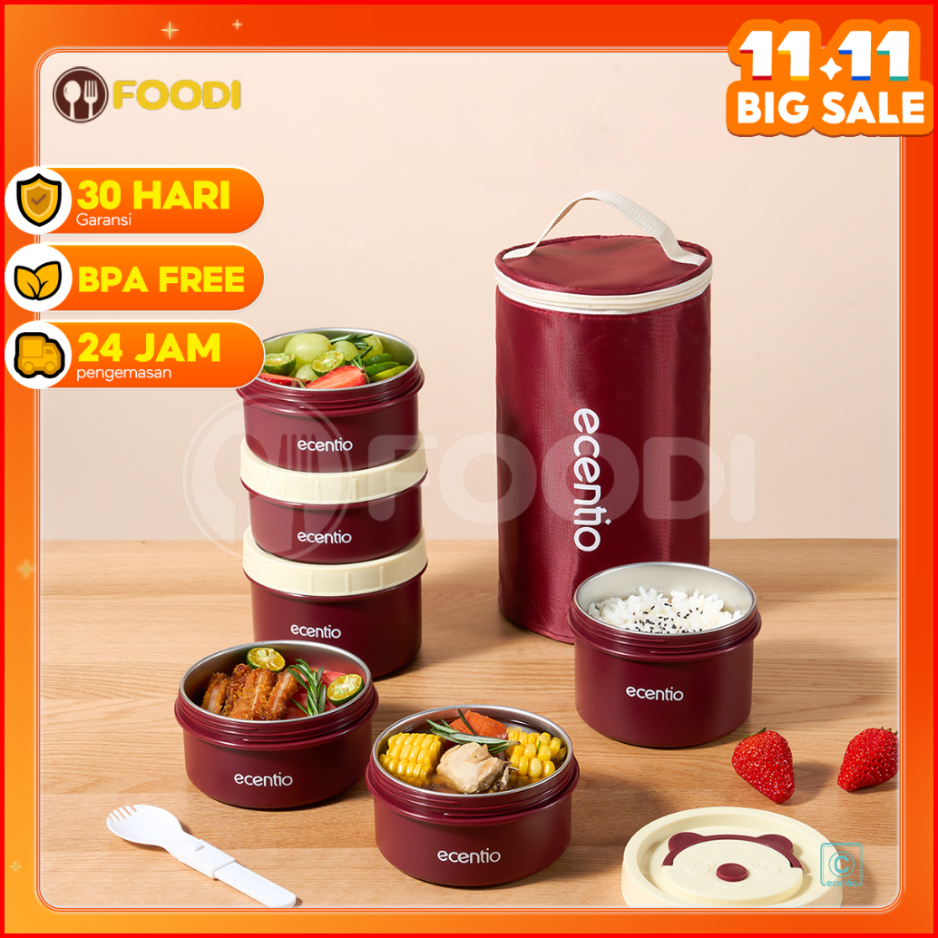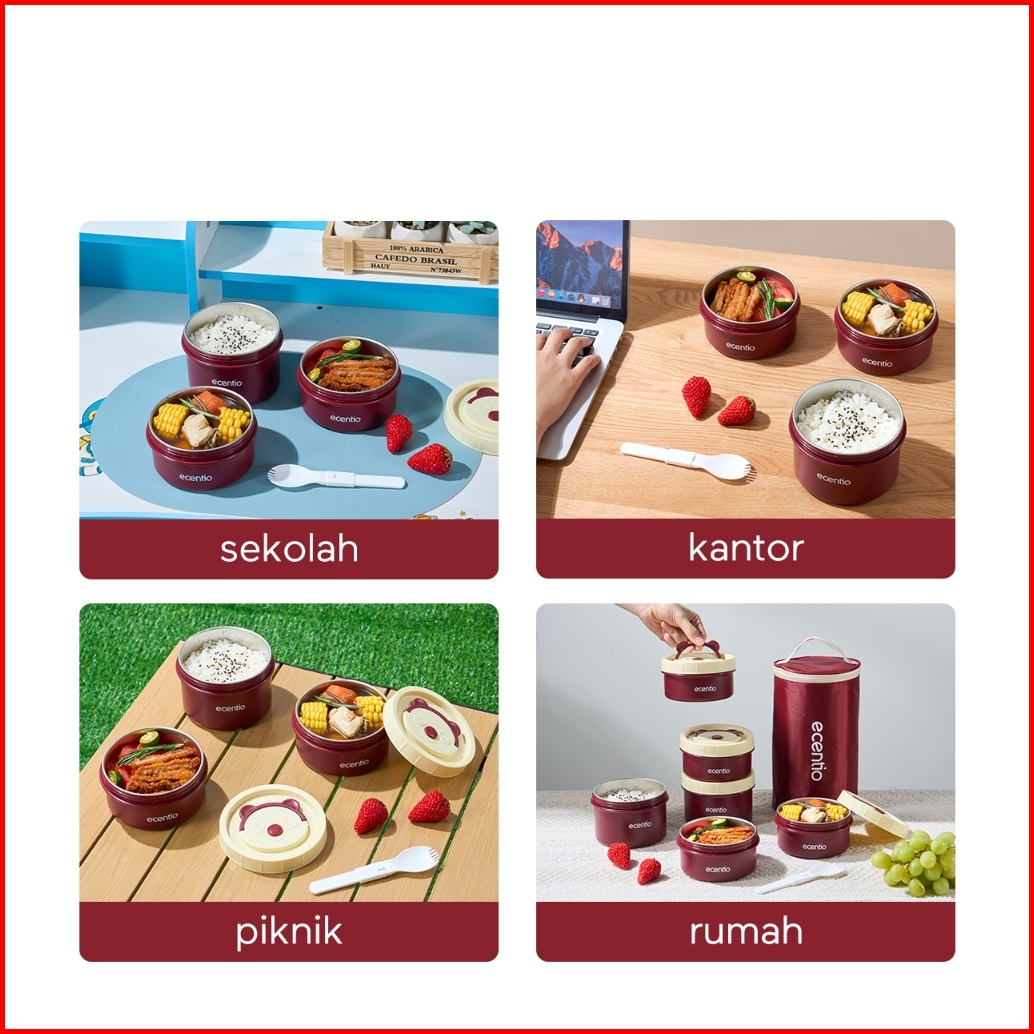Ecentio Lunch Box Kotak Makan 4pcs Set Stainless 304 Anti Tumpah Merah