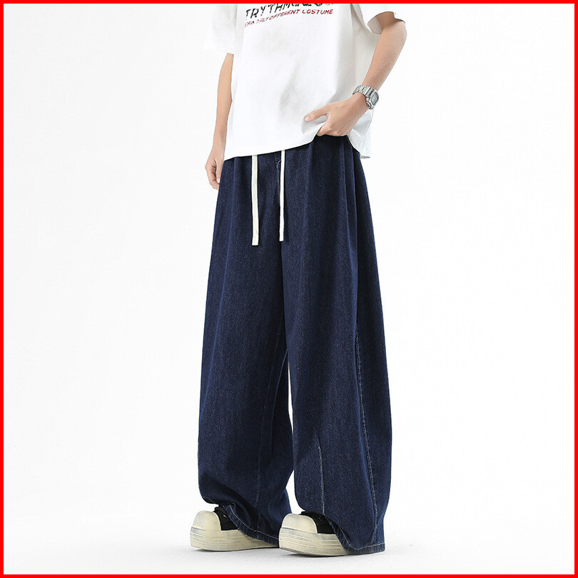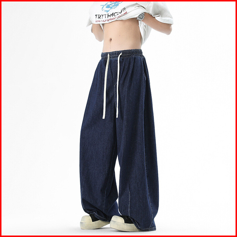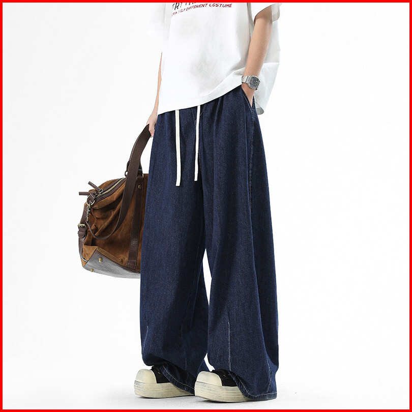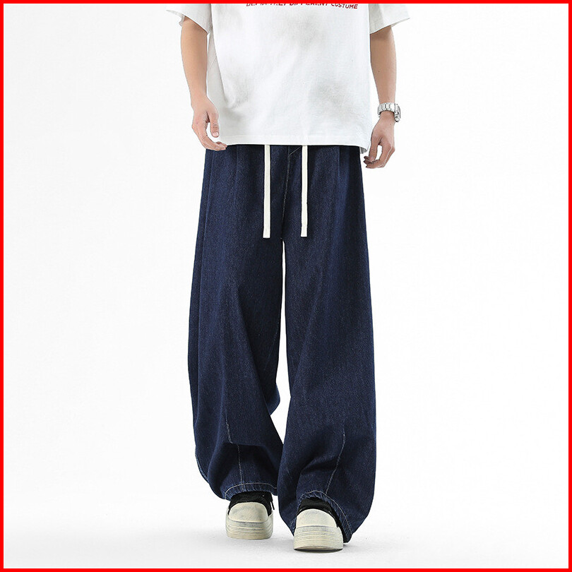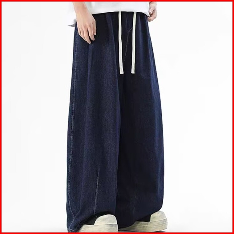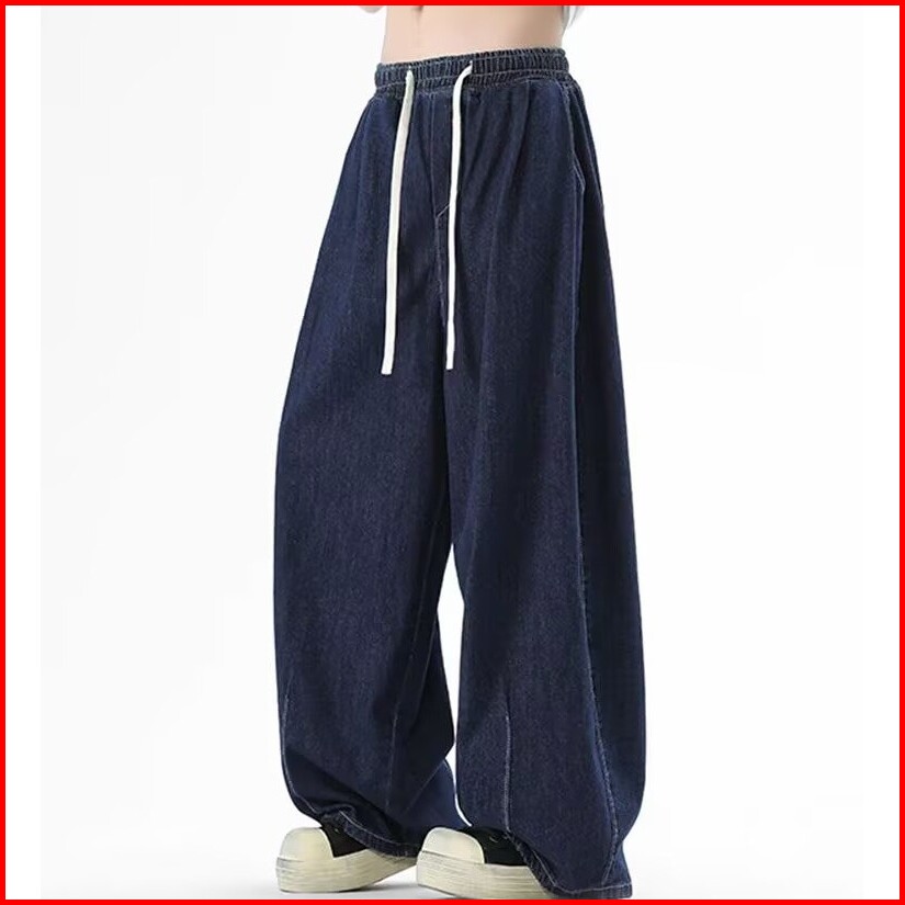 St.lab Studio Celana Jeans Pria Biru Tua Pinggang Elastis Longgar Ukuran Besar Celana Denim Kaki Lebar