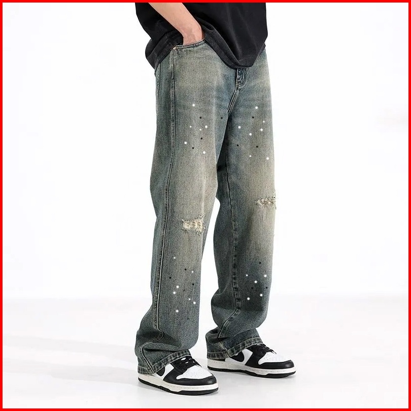Keyboy Celana Jeans Pria Panjang Baggy Sobek Retro Titik Tinta Celana Dewasa Cowok Vintage Casual Robek Denim Pants Kore