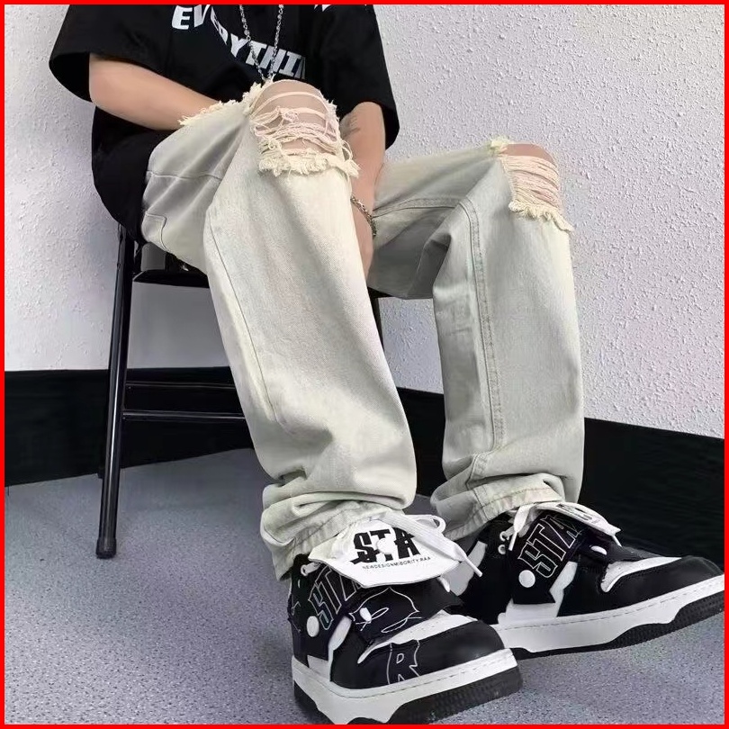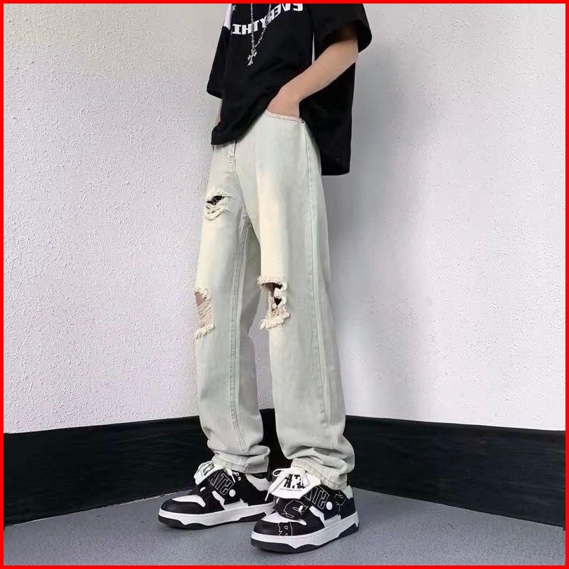 Keyboy Celana Jeans Pria Retro Sobek Straight Panjang Celana Dewasa Cowok Vintage Casual Denim Pants Korean Style