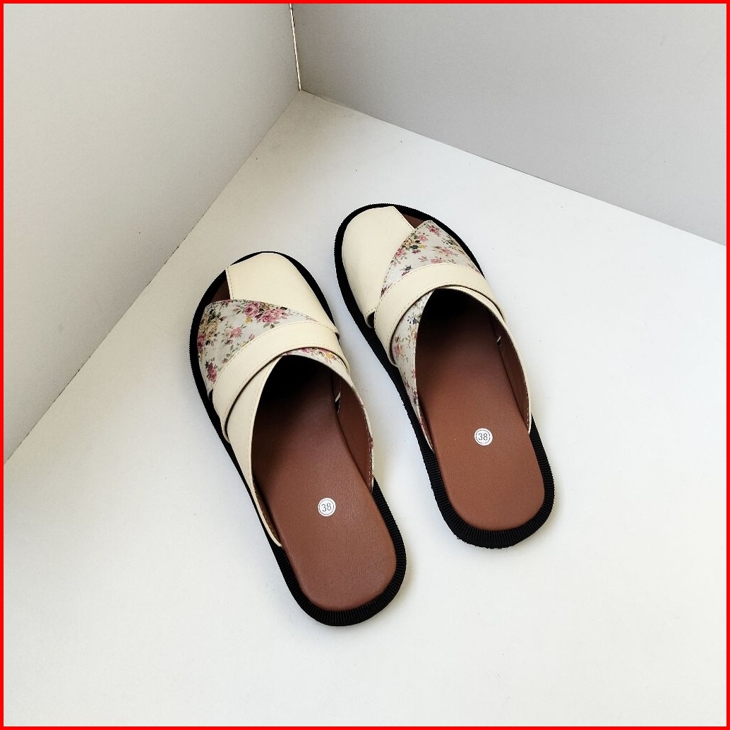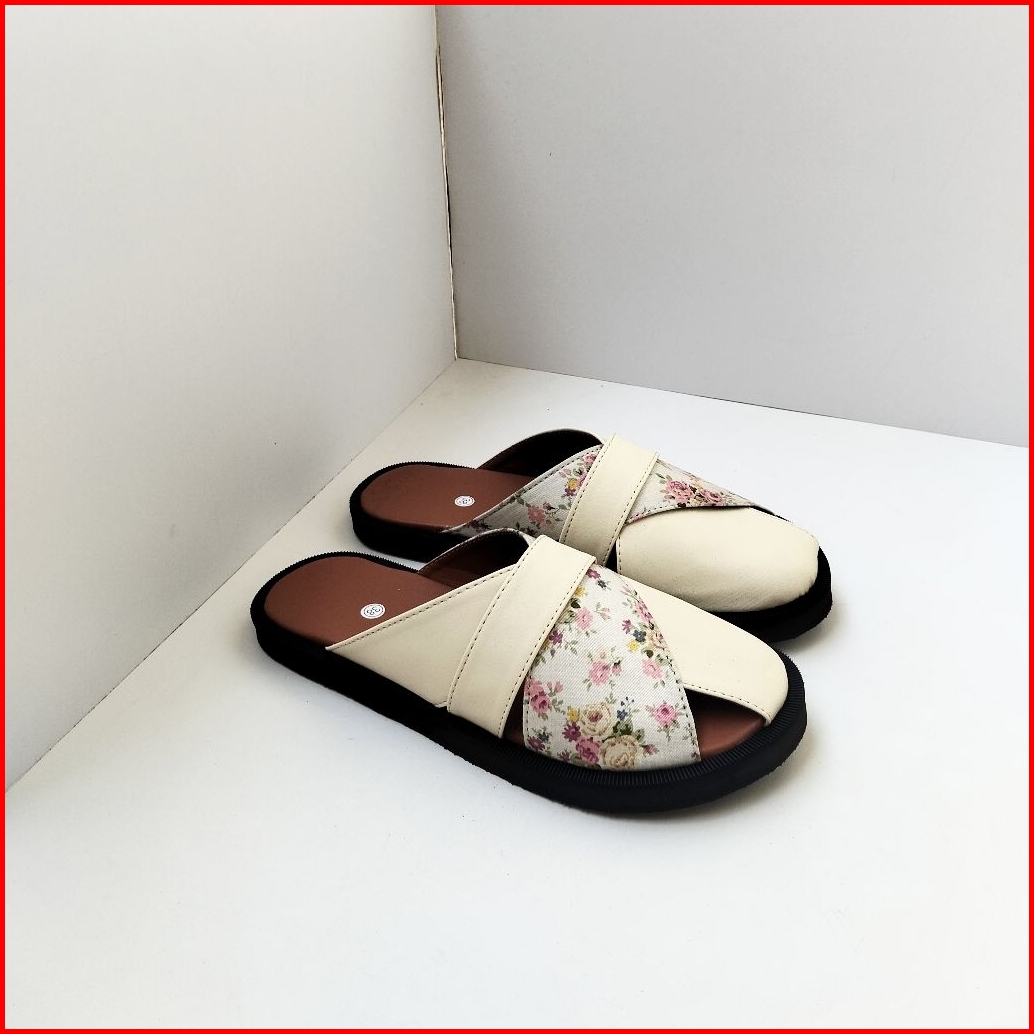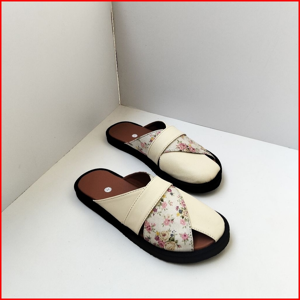 Sandal Flat Wanita Raya Sendal Wanita Kasual Motif Bunga Cream