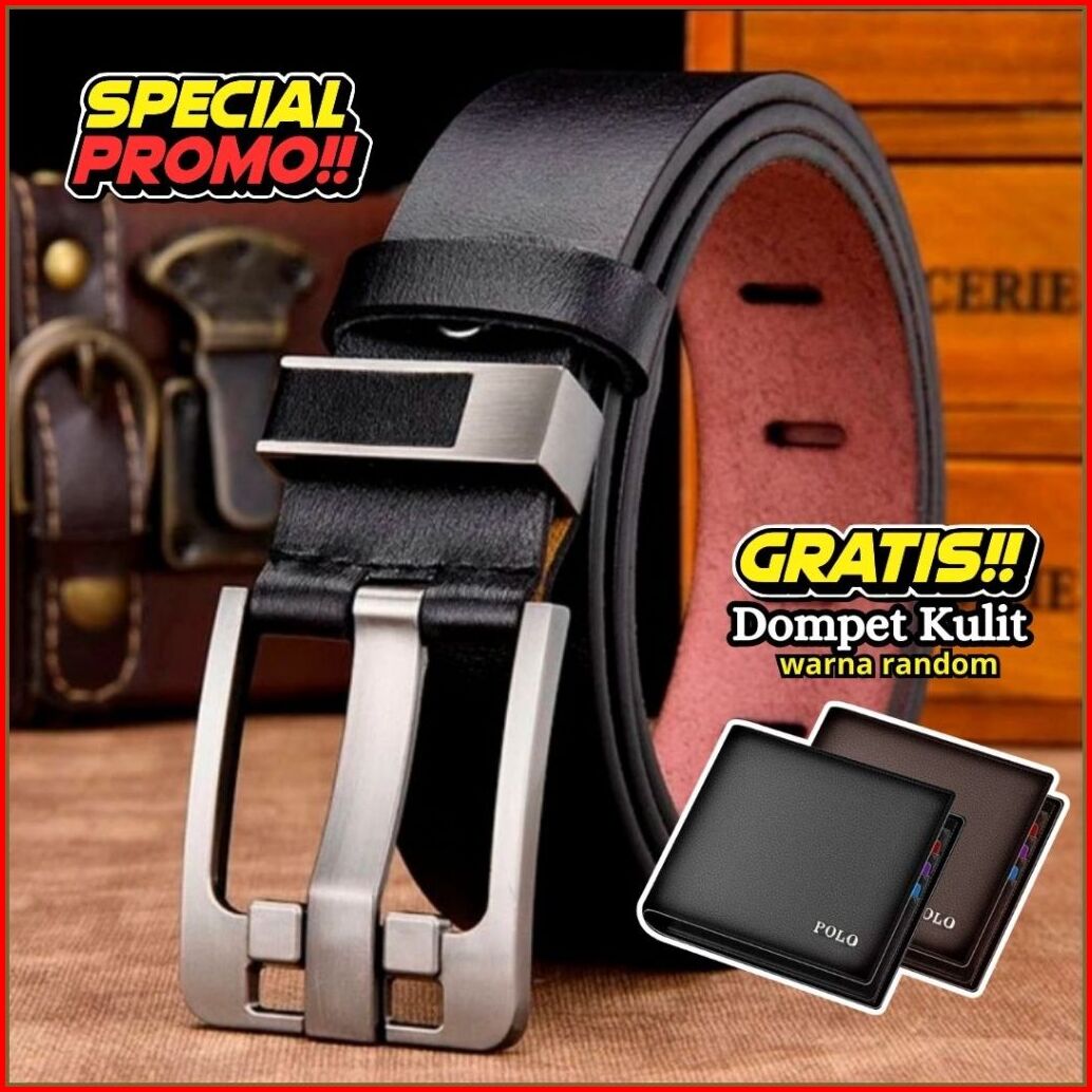 Ikat Pinggang Kulit Asli 2 Lapisan Kulit Gesper Fashion Korea Formal Pria Gratis Dompet
