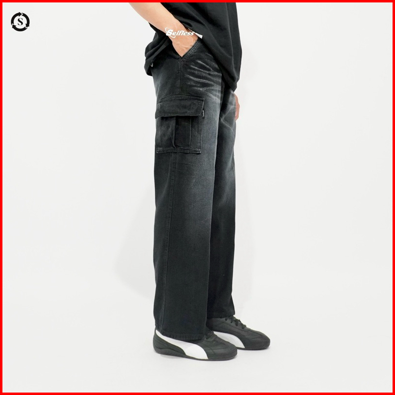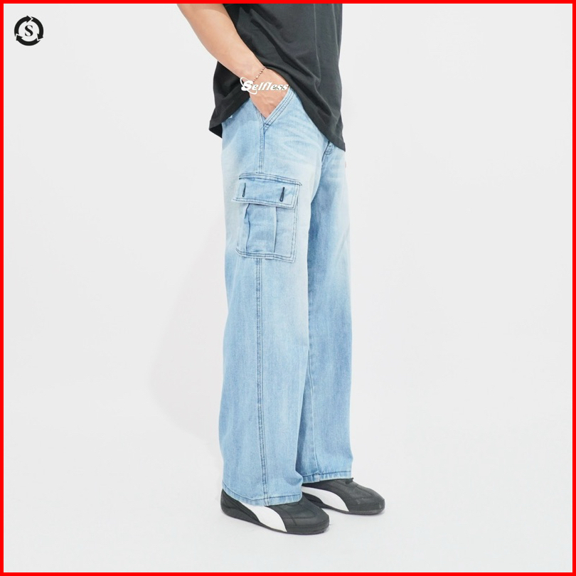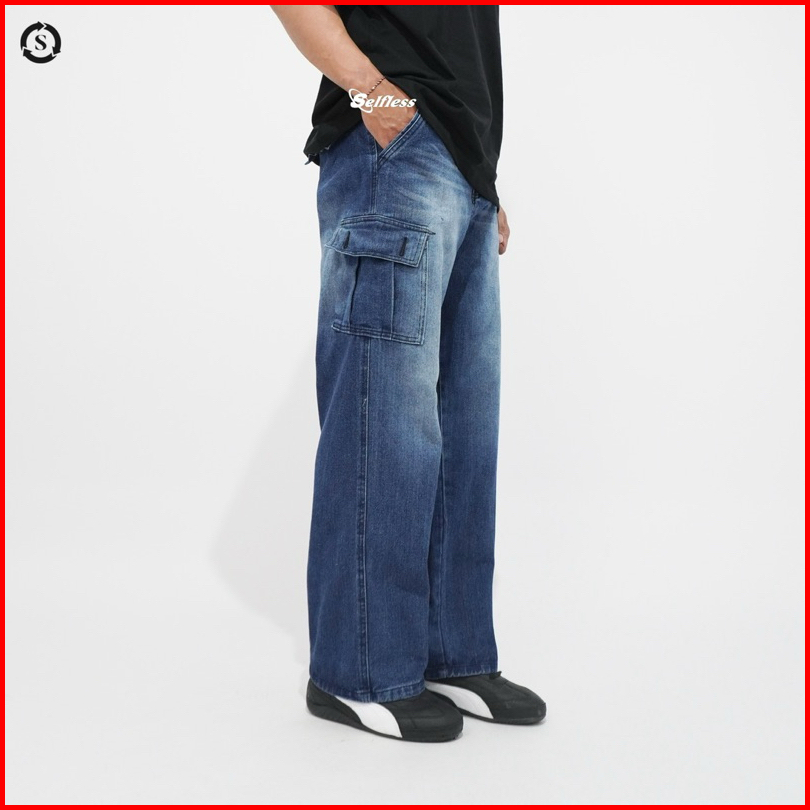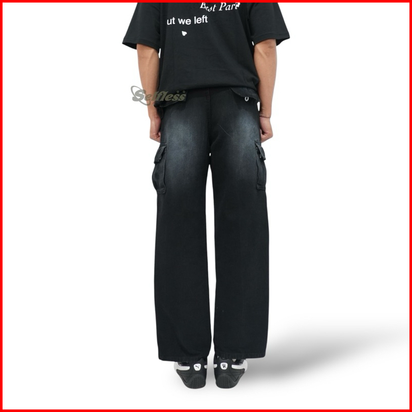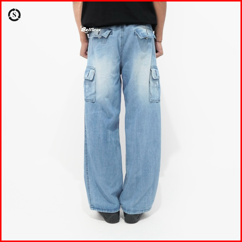 Selfless - Celana Cargo Loose Jeans Washed Wide Leg Wisker Lebar Baggy