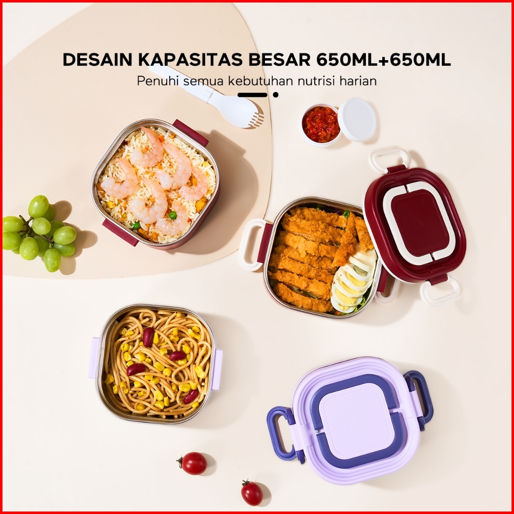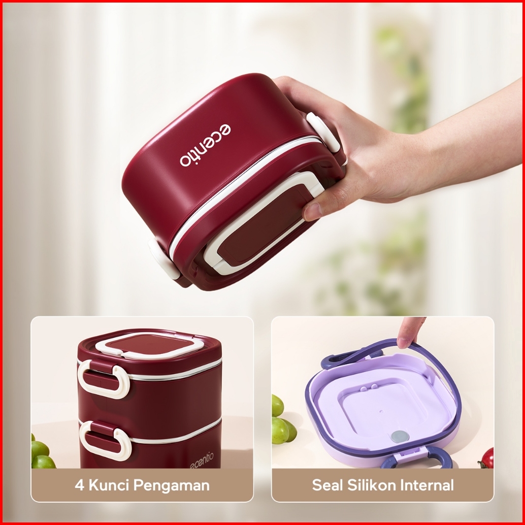 Ecentio Kotak Bekal Bulat Stainless Steel Double Layer 650ml 650ml Lunch Box Wadah Makan Bento Kapasitas Besar Tahan Boc