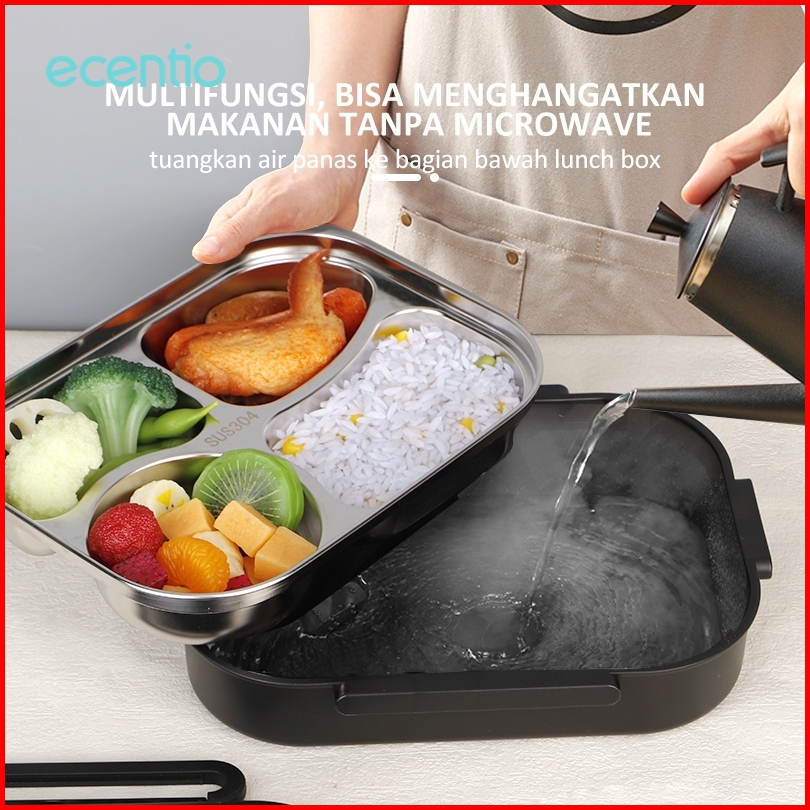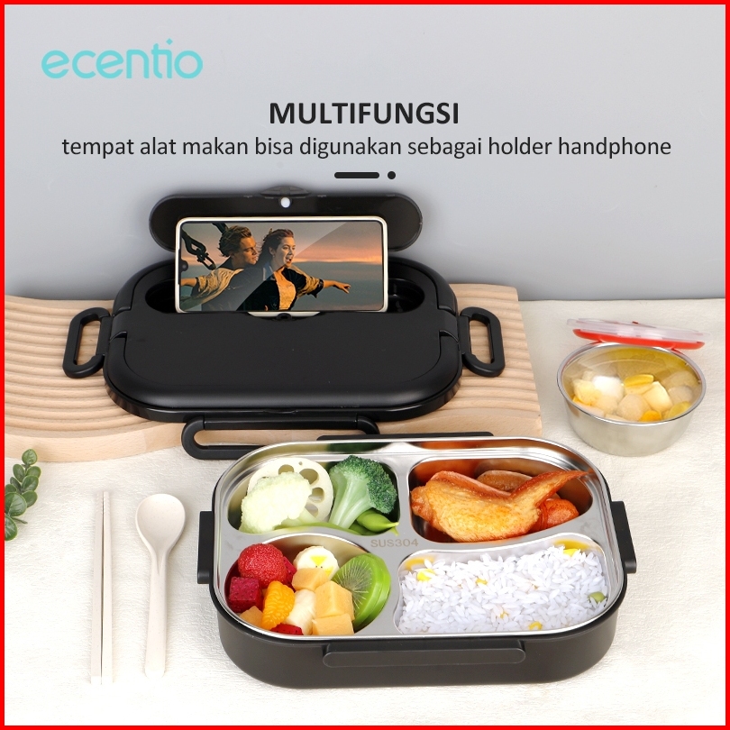 Ecentio Lunch Box 1000ml Stainless 304 Sekat 4 Dan Tempat Sup Kotak Makan Anti Tumpah Free Sendok Sumpit Hitam