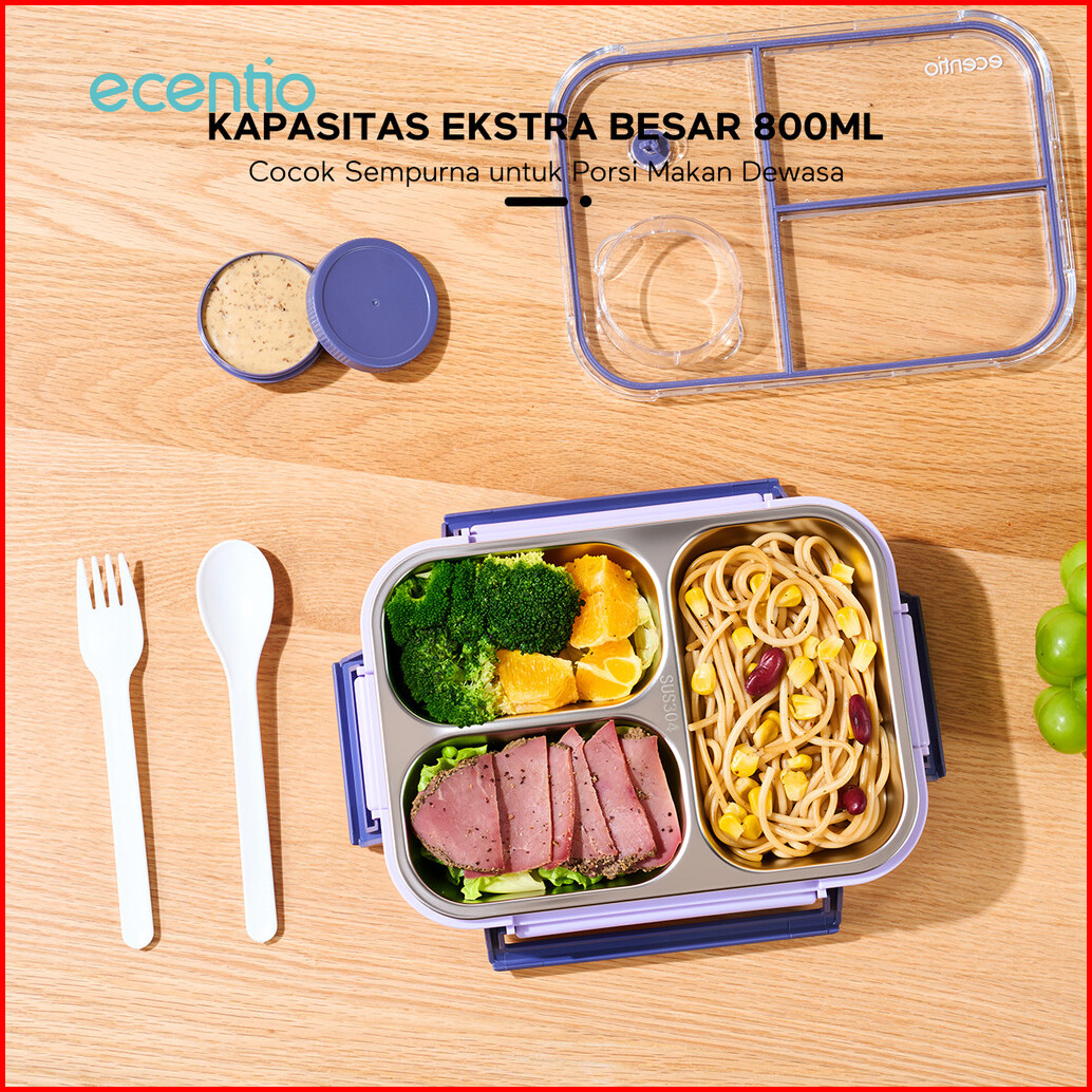 New Ecentio Lunch Box Stainless Plastic 800ml Sekat 3 Dengan Sendok Free Kotak Sauce Kecil