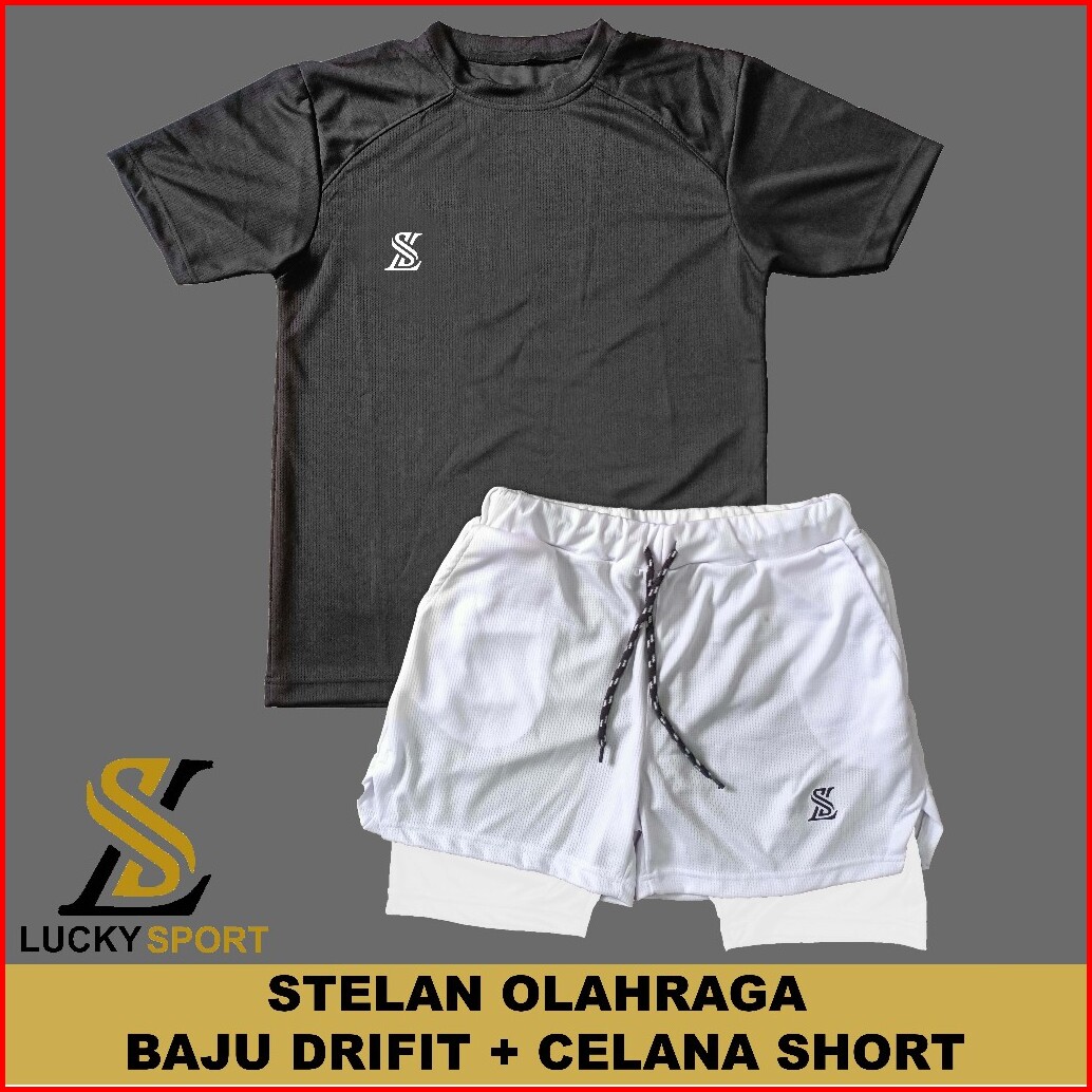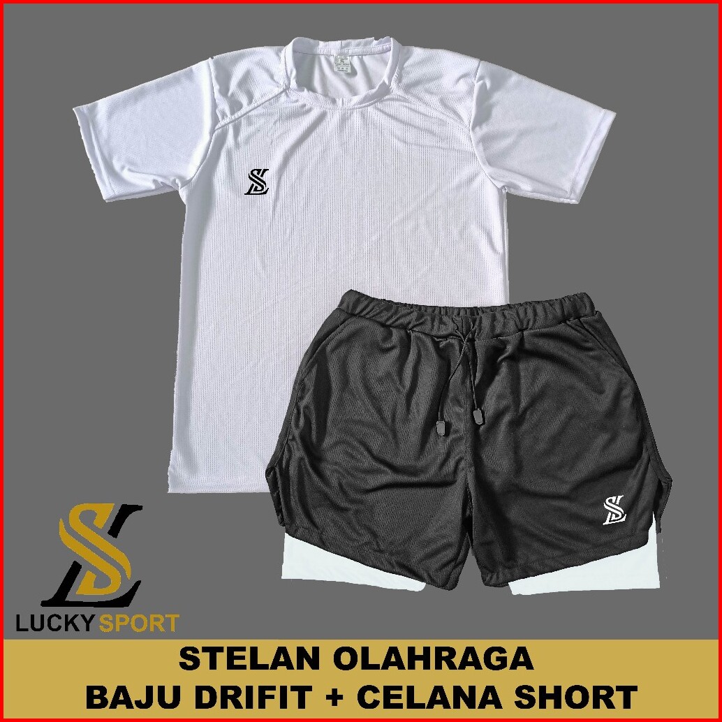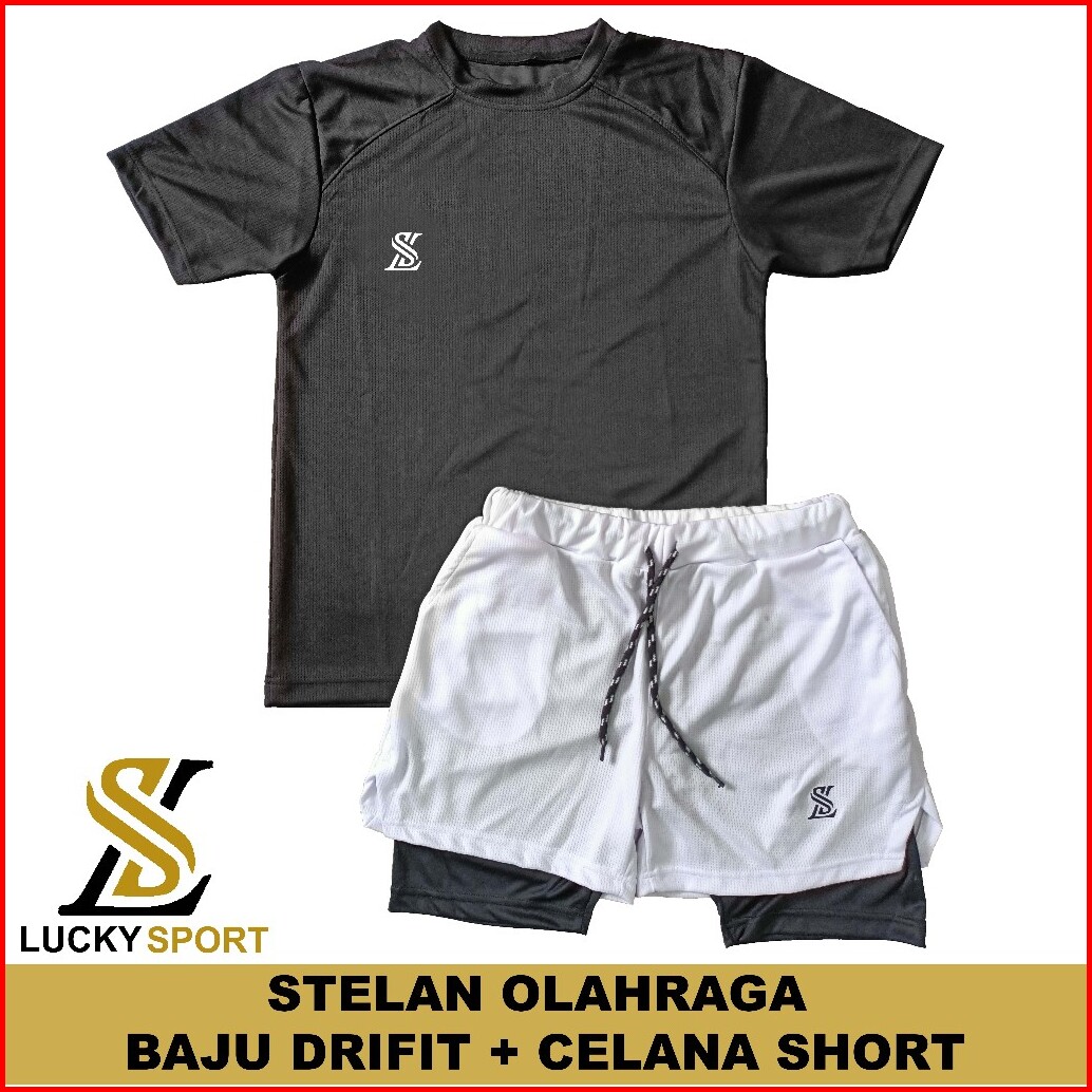 Setelan Olahraga Pria Double Layer 1 Set Baju Kaos Dryfit Celana Pakaian Outdoor Running Gym Lari Badminton Volly Futsal