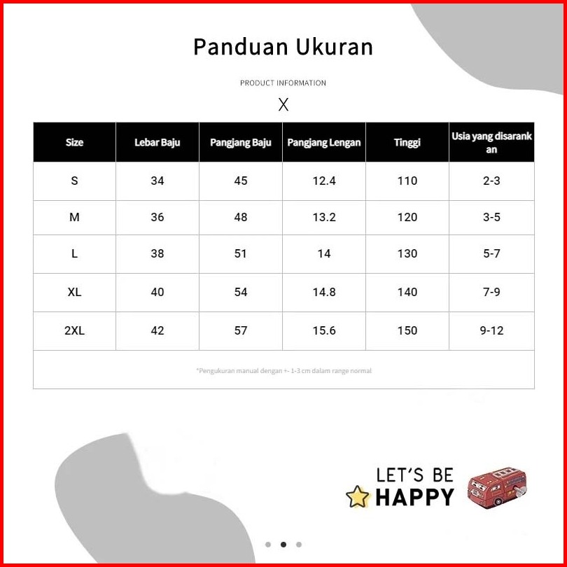 M(3-5 tahun), L(5-7 tahun), XL(7-9 tahun), XXL(9-12 tahun)