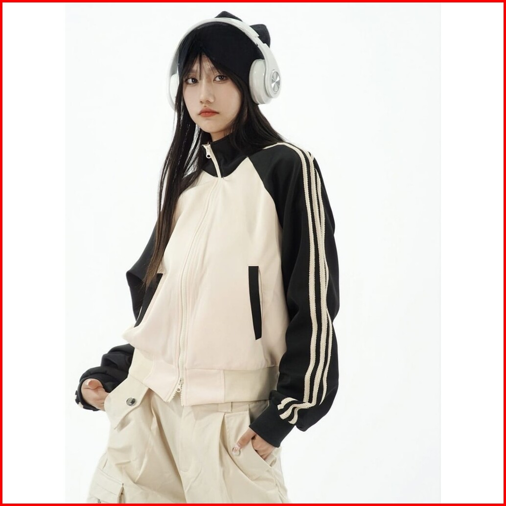 Femes Stripy Basic Jacket Outerwear Zipper Crop Wanita All Size Fit To Xl Ootd Korean Style Casual Daily