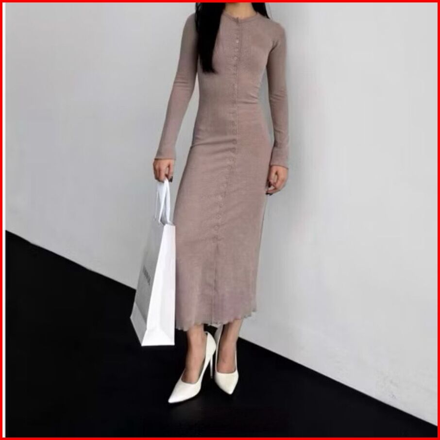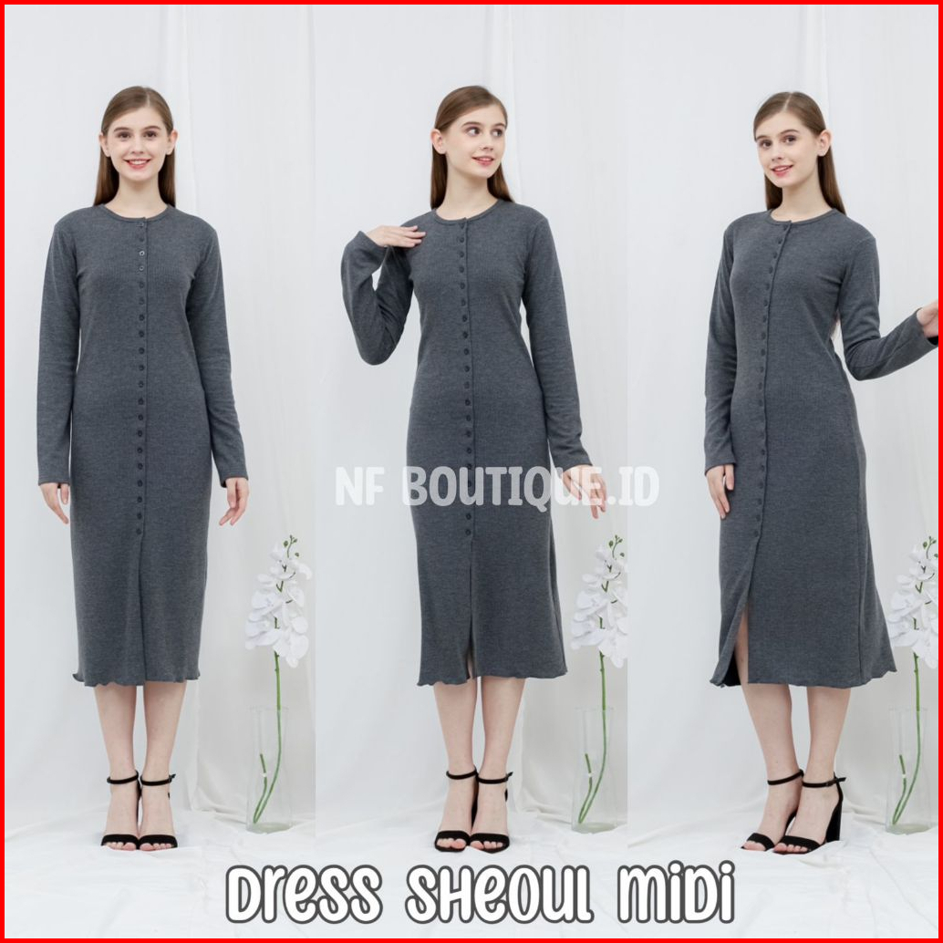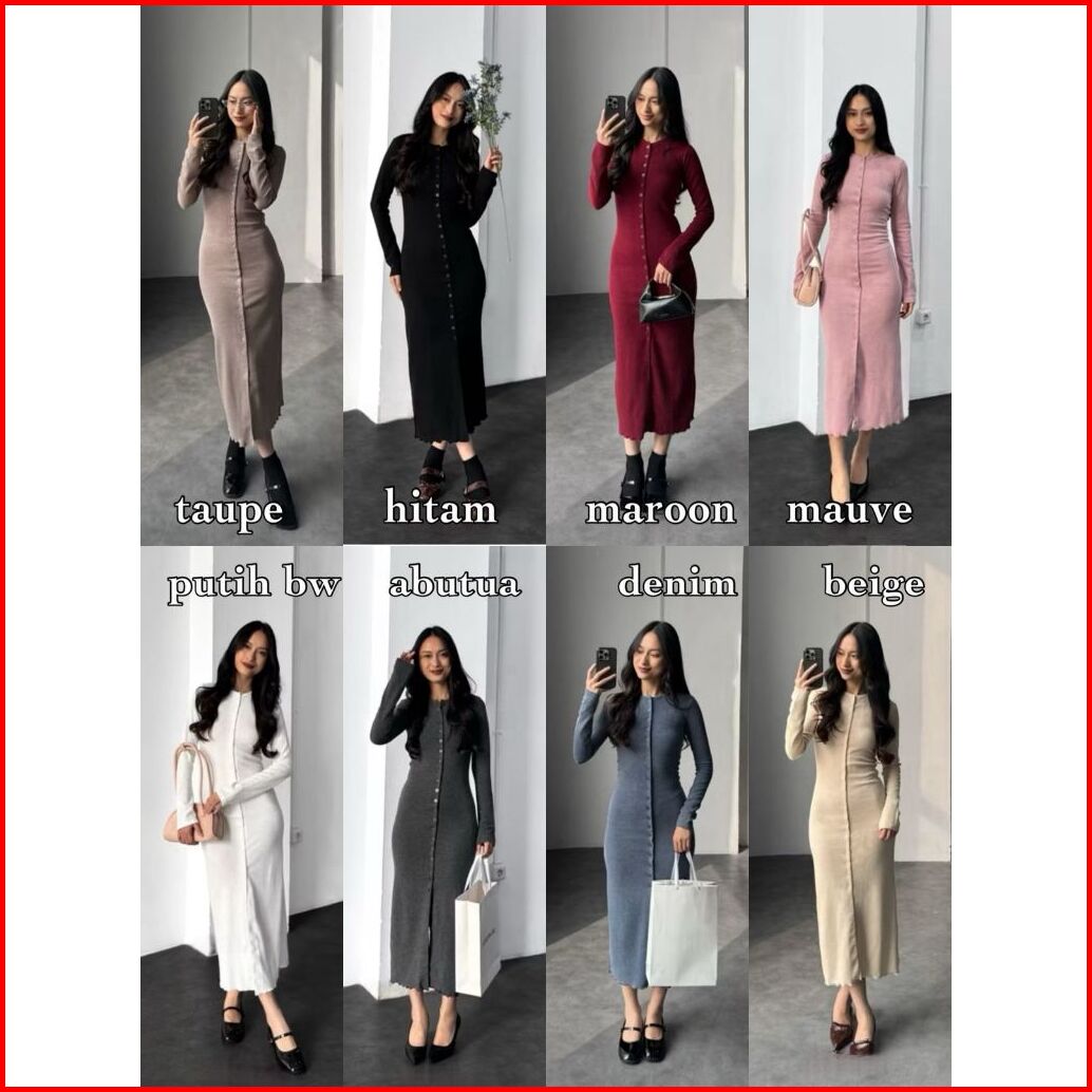 Dress Knit Rib Full Kancing Korean Look Dress Sheoul Basic Woman Longsleeve Knit Dres Dress Bodycon