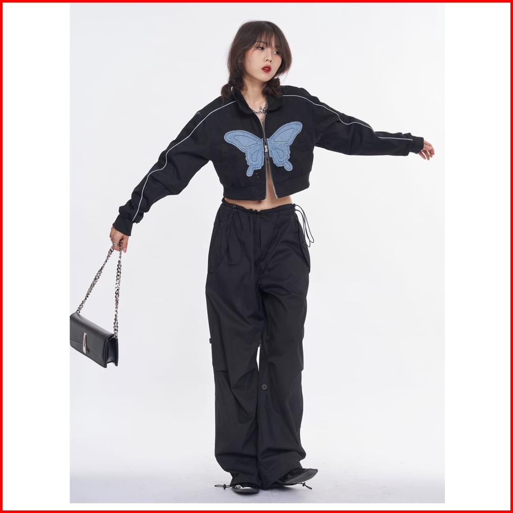 Femes Butterfly Jaket Crope Outerwear Wanita Remaja Matt Fleece Sablon Ootd Korean Style Casual Daily