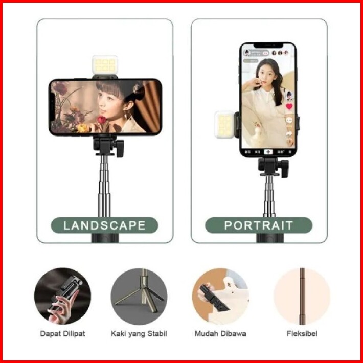 Tongkat Selfie Stick R1s Tongsis Lipat Mini 4in1 Plus Remote Control Bluetooth Tripod Plus Lampu Led Flash R1s Led Selfi