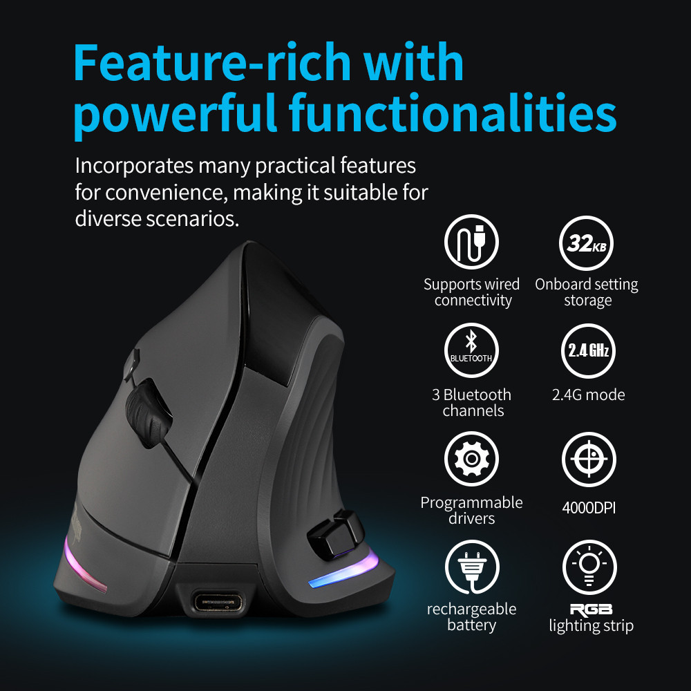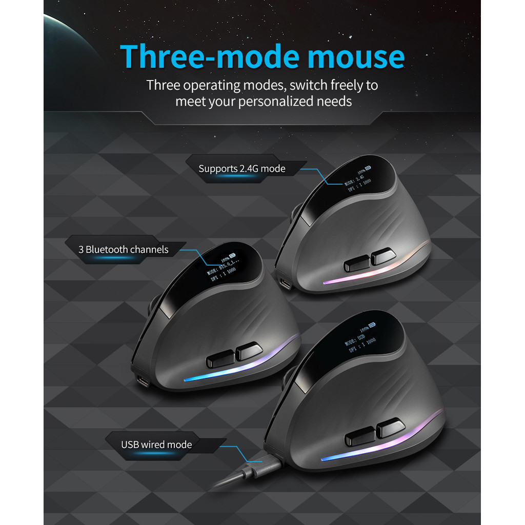 Zelotes F35C Silent Click Bluetooth Wireless 2.4G RGB Programmable Vertical Macro Mouse With Oled Display