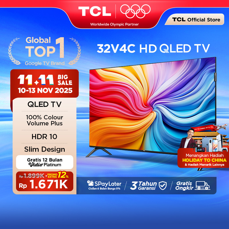 TCL HD QLED TV 32 inch V4C - HDR 10 - Dolby Audio - Play/Netflix/Youtube/Disney+Hotstar - Smart Android 24 LED Digital Promo Murah G9 (Model: 32V4C)