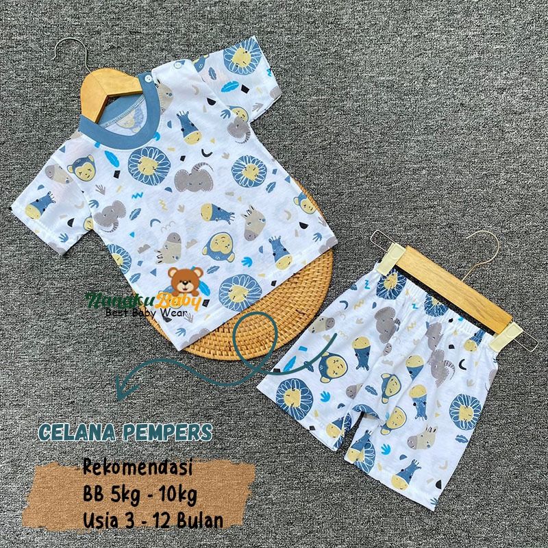 Nanaku Baby - Setelan Baju Pendek Bayi Kancing Bahu & Celana Pempers Motif Mamalia | Rekomendasi usia 3-12 Bulan