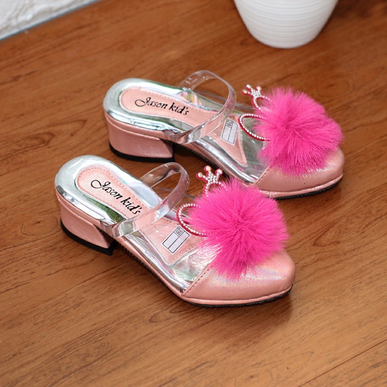Sandal Sepatu Anak Perempuan Hak 3cm | Motif Bulu Kitty | Mika Bening Heels Selop Pesta Cewek | Cocok SM1